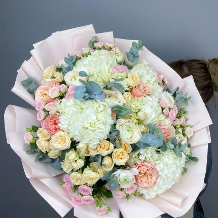 Жемчуга – Шляпная коробка с пионами, гортензиями и пионовидными розами