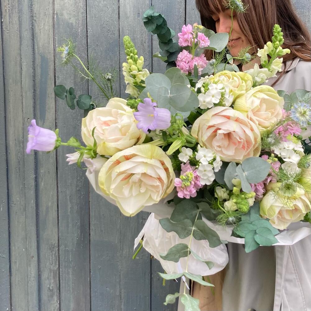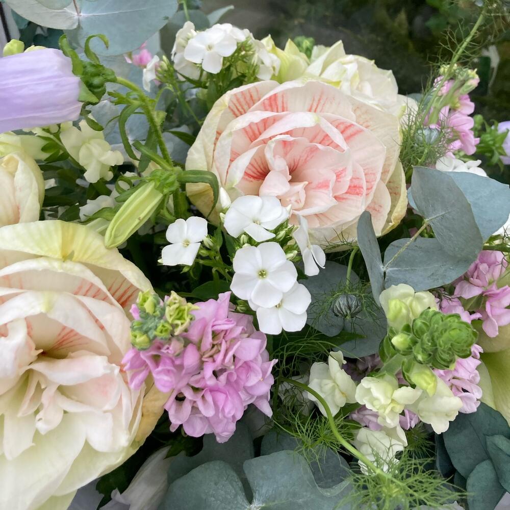 Садовый букет с колокольчиками, душистой маттиолой, львиным зевом, флоксами, амариллисами и эвкалиптом.Стильное цветочное решение для любого случая.