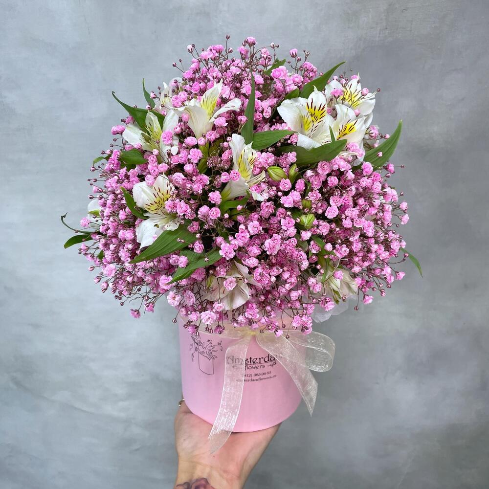 Альстромерия – 5 шт.Гипсофила розовая – 3 шт.Коробка d12 – 1 шт.Оазис – 1 шт.
