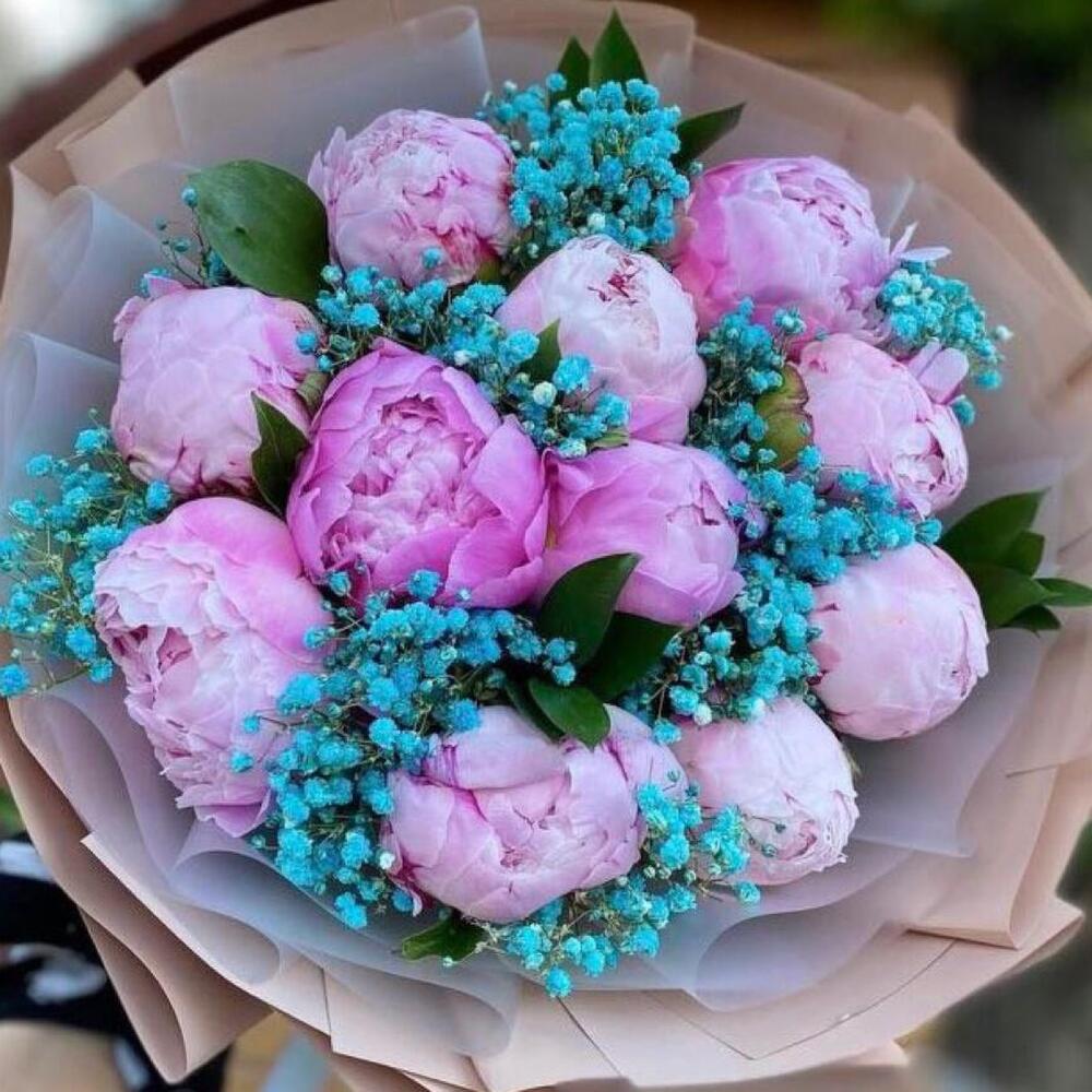 Пион розовый – 11 шт.Гипсофила голубая – 10 шт.Упаковка дизайнерская – 2 шт.Лента атласная – 2 шт.Открыточка с вашими пожеланиями – 1 шт.хорошее настроение – 100 шт.инструкция по уходу за цветами – 1 шт.коробка переноска – 1 шт.Кризал – 1 шт.