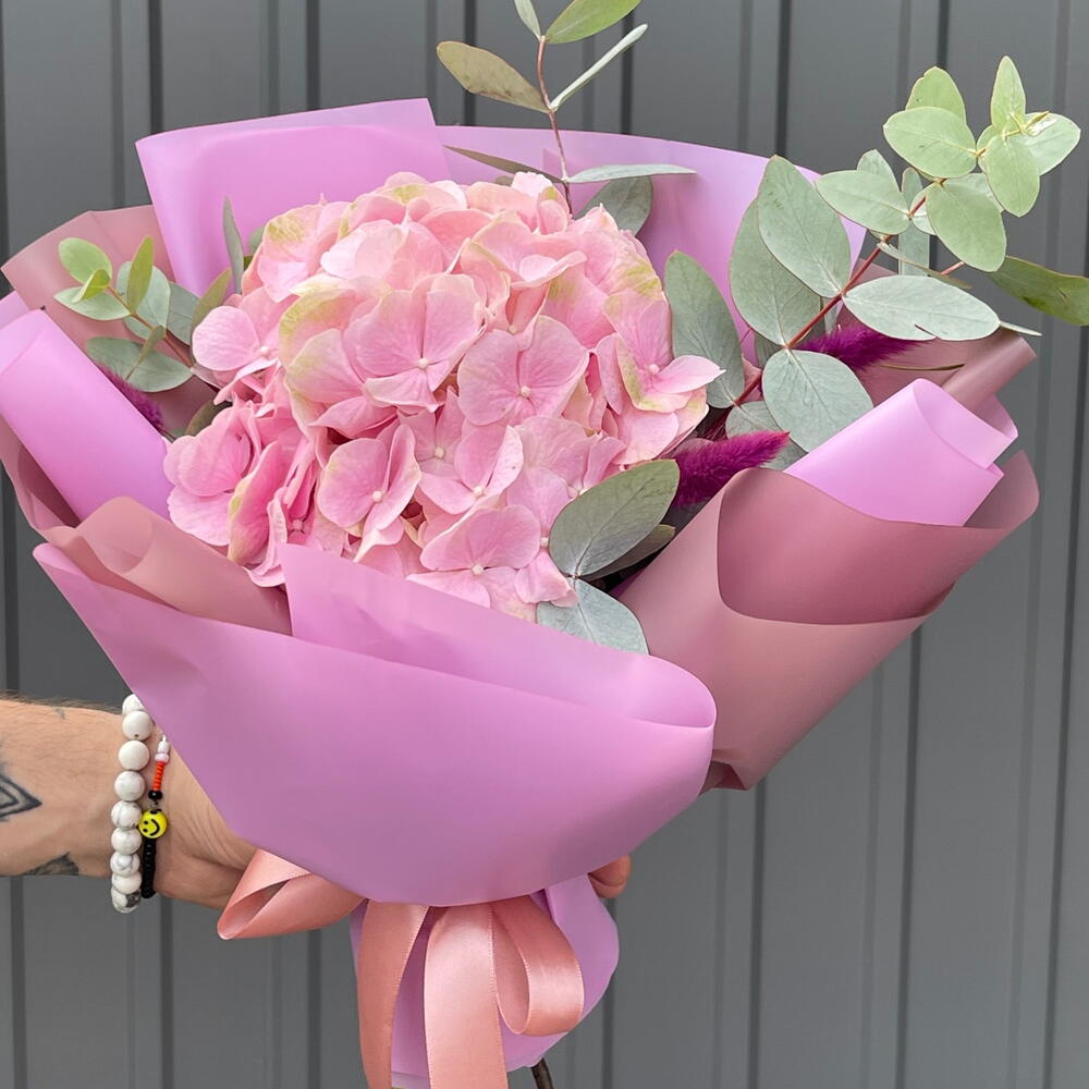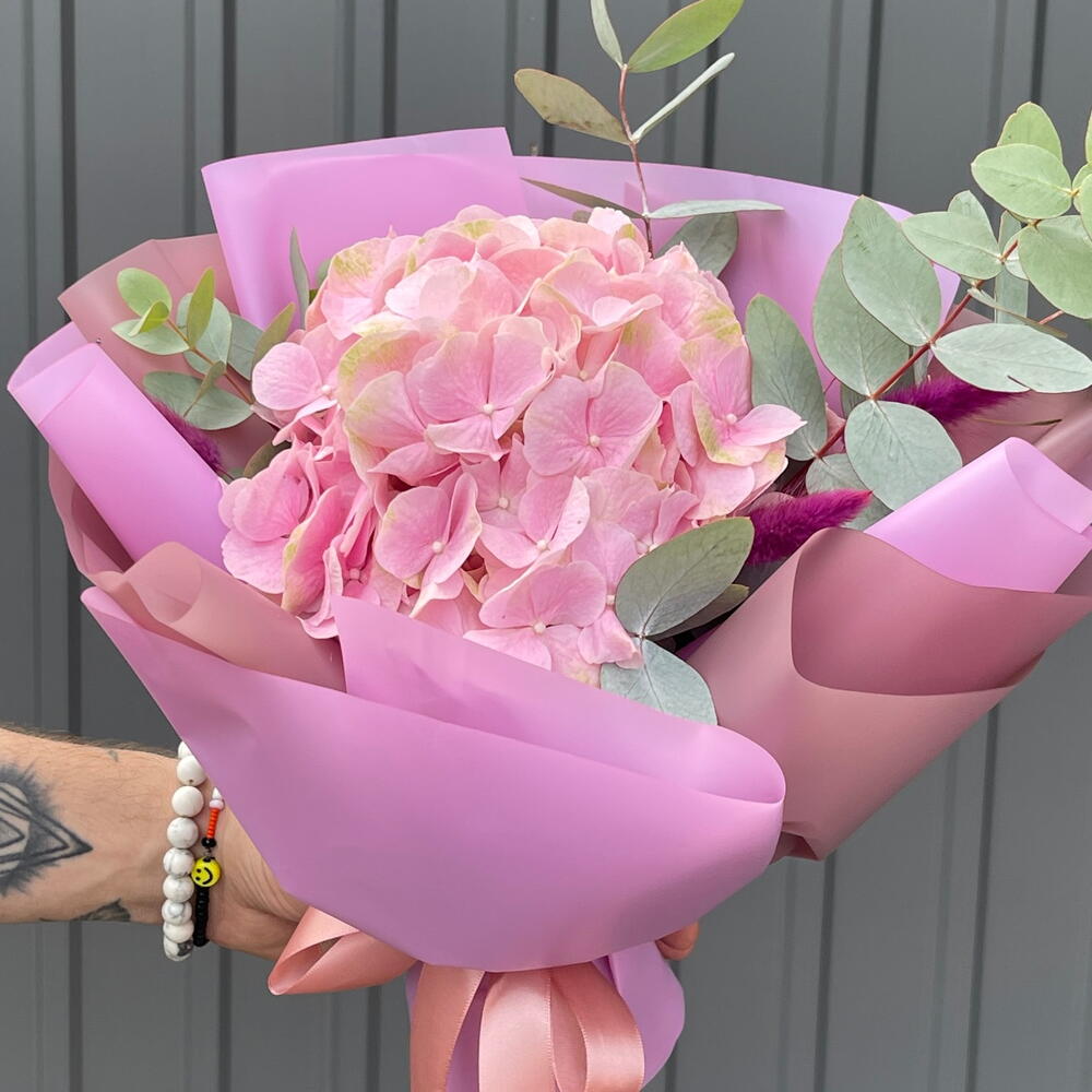 Лагурус – 5 шт. оформлення букета – 1 шт. евкаліпт гілка – 3 шт. гортензія верена – 1 шт.