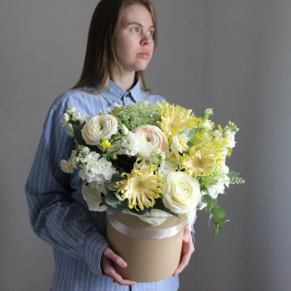гербера кучерявая – 5 шт.Ранункулюс – 5 шт.Амми – 3 шт.Маттиола – 3 шт.Нарцисс – 2 шт.Лизиантус – 3 шт.Гвоздика – 6 шт.Гринбелл – 2 шт.Эвкалипт – 5 шт.Фисташка – 2 шт.Оазис флористический – 1 шт.Коробка шляпная – 1 шт.