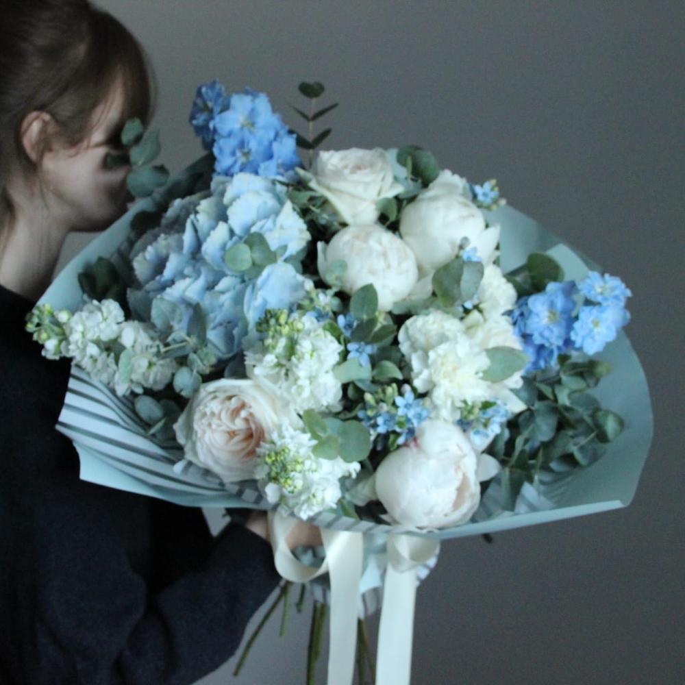 Дельфиниум – 2 шт.Твидия – 5 шт.Ранункулюс – 3 шт.Пион – 3 шт.Маттиола – 3 шт.Гвоздика – 5 шт.Упаковка дизайнерская – 2 шт.Лента атласная – 1 шт.