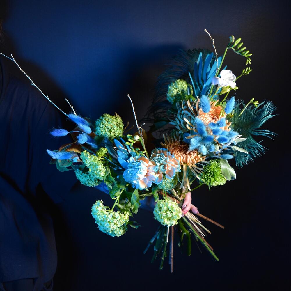 цимбидиум ветка – 1 шт.Хризантема – 4 шт.Гвоздика – 5 шт.Вибурнум – 3 шт.леукондендрон – 3 шт.мелкоцвет – 5 шт.Сухоцветы – 10 шт.