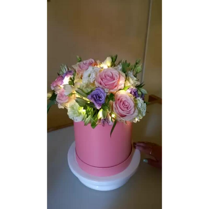 Альстромерия – 4 шт.Роза Эквадор – 9 шт.Гвоздика – 4 шт.Коробка шляпная – 1 шт.Вероника – 4 шт.Гирлянда – 1 шт.