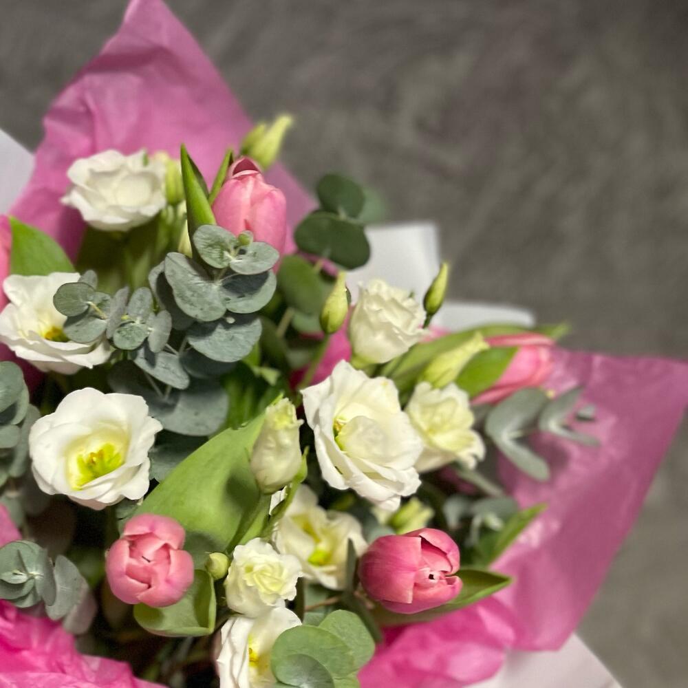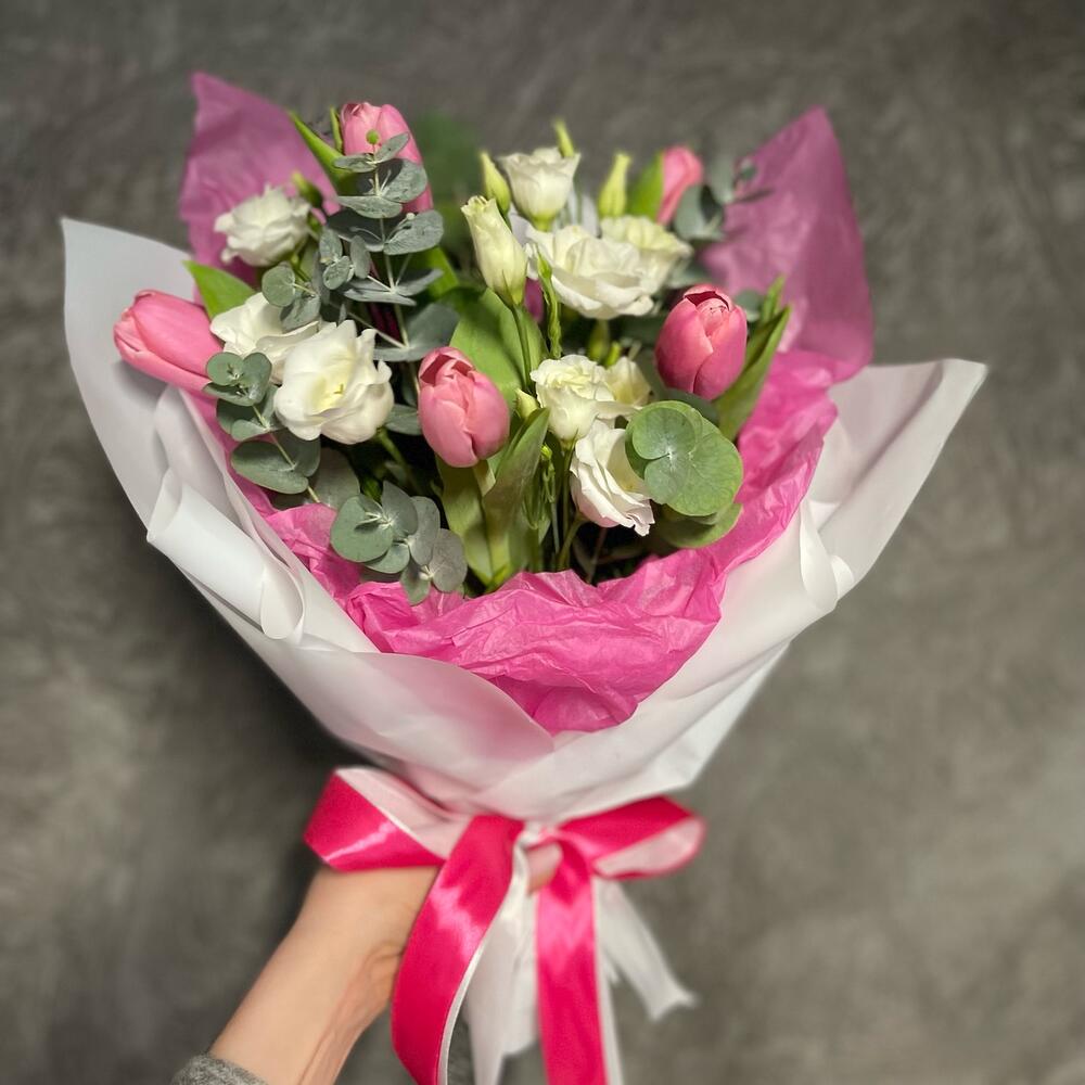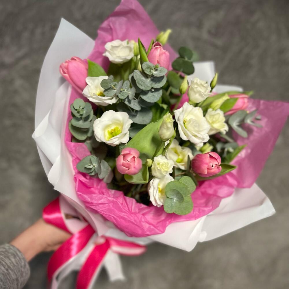 Тюльпан – 5 шт.Ваксфлауэр – 1 шт.Диантус кустовой – 7 шт.Эвкалипт Baby Blue – 15 шт.Упаковка дизайнерская – 2 шт.Лента атласная – 2 шт.