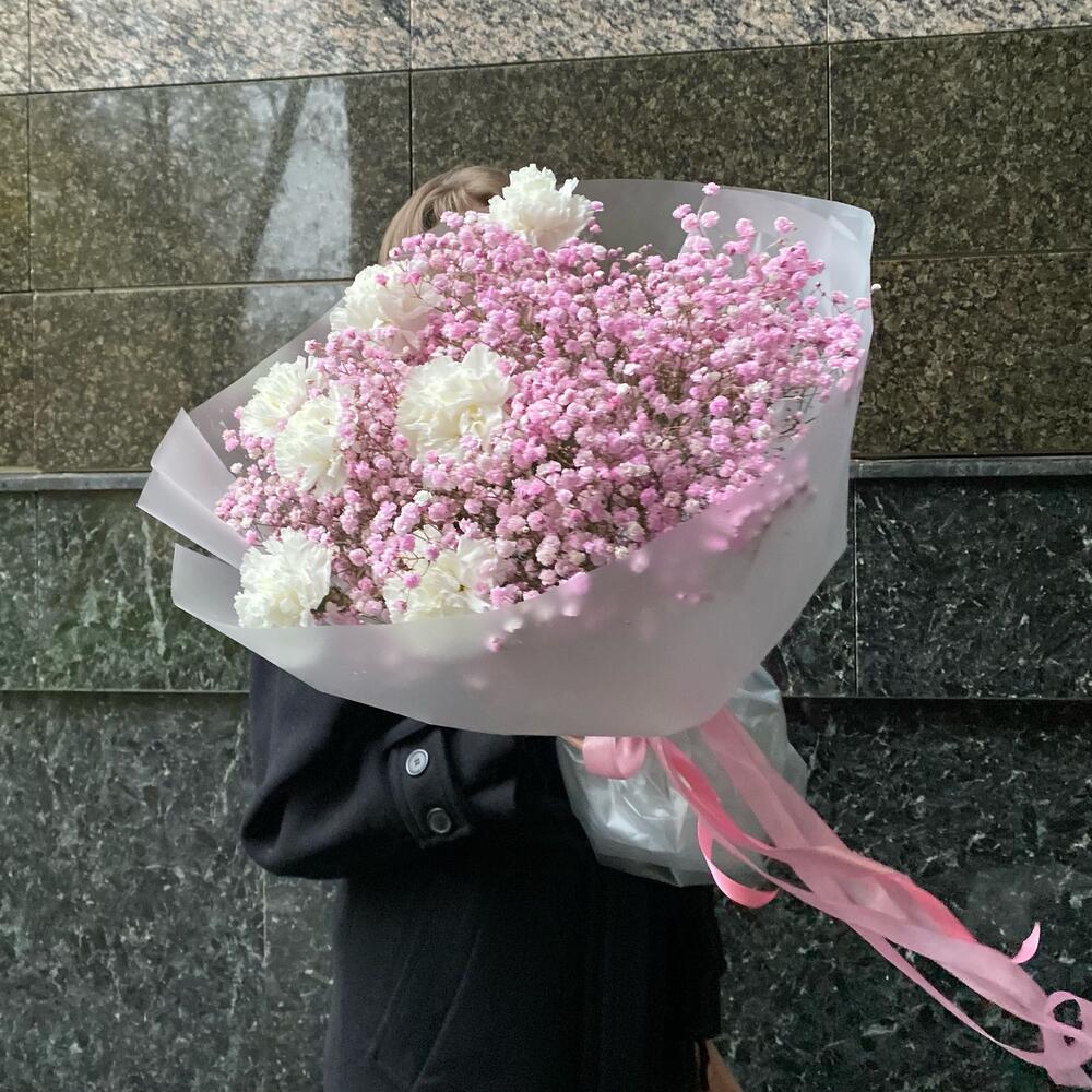 Букет для тех кто ценит стиль и минимализм Букет из диантусов и воздушной гипсофилы в упаковке с пышными лентами К заказу мы добавляем инструкцию по уходу за цветами и средство для продления жизни букета в подарок Вы можете дополнить заказ воздушными шарами или … Показать ещёкоробкой сюрпризом , ознакомтесь со всем ассортиментом нашего магазина