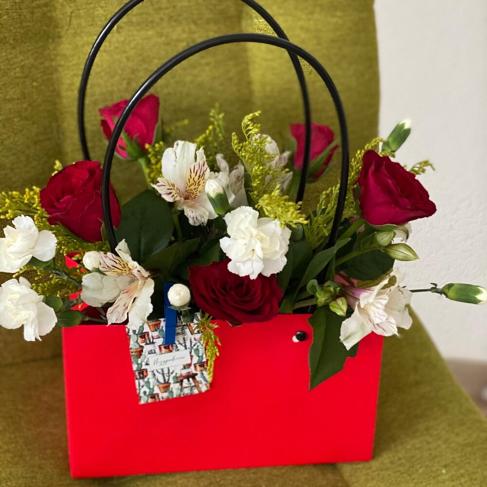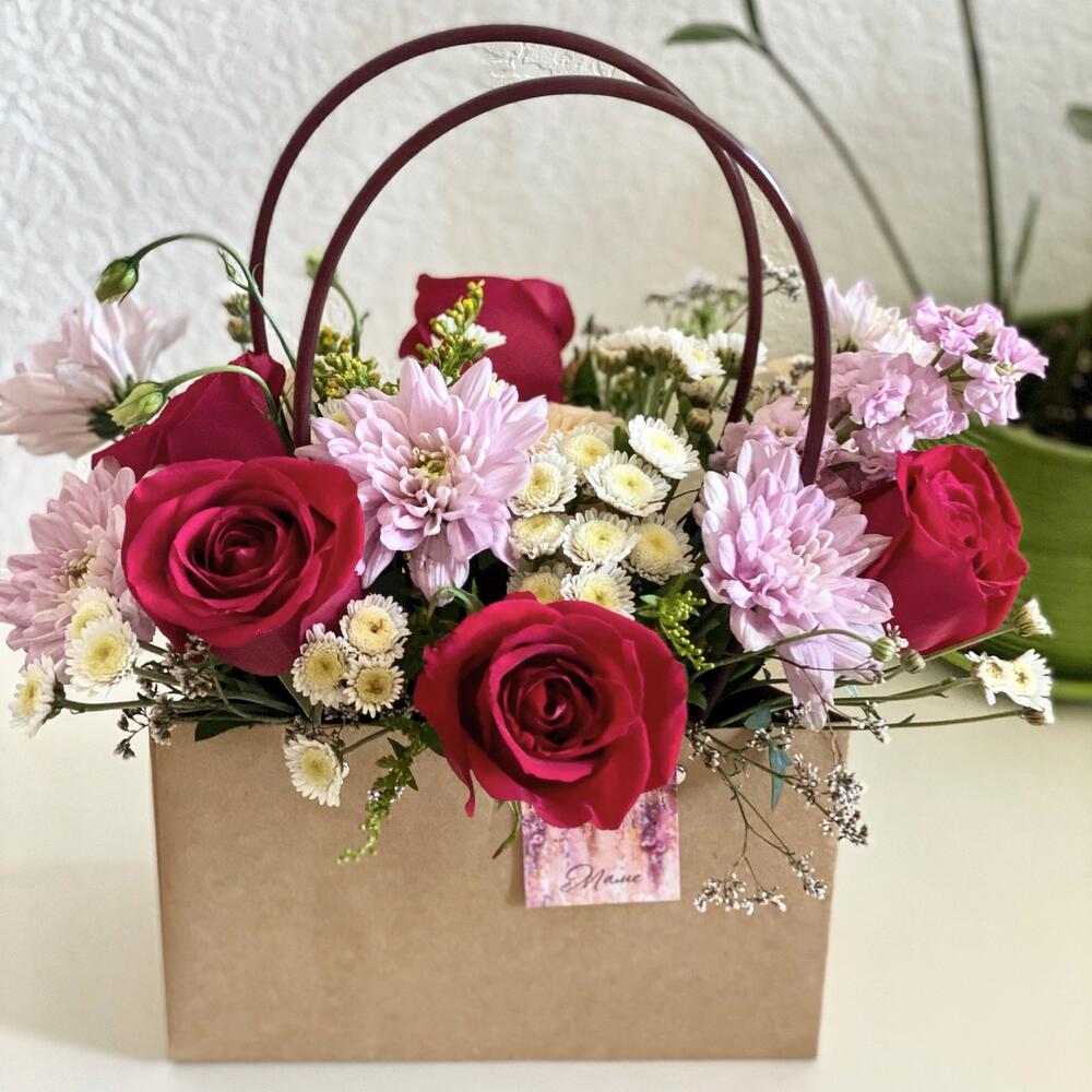 Цветочная композиция в губке. Удобная упаковка в виде сумочки с ручками идеальна для транспортировки и последующего хранения. Не требует никакого специального хранения