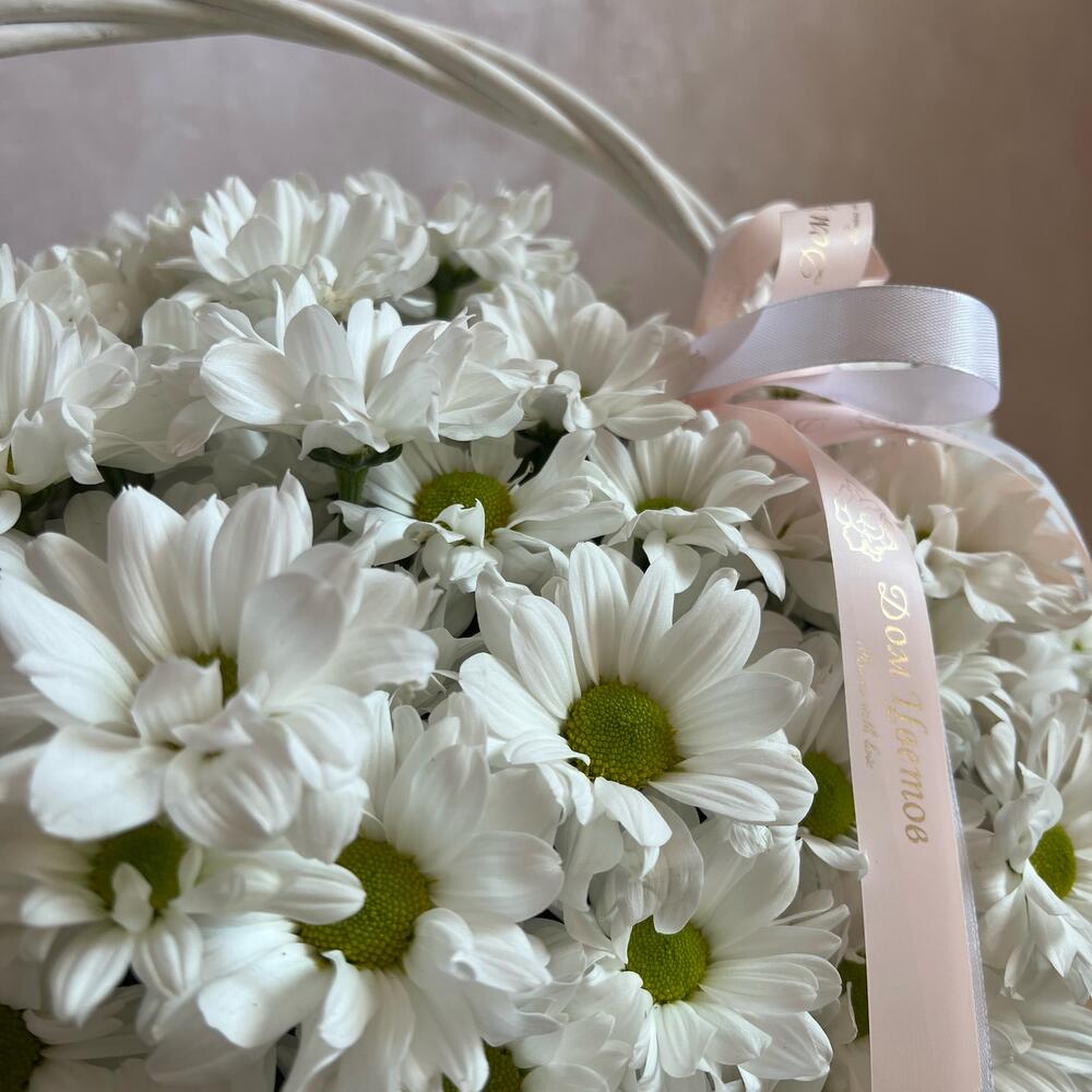 кустовая хризантема ромашка – 30 шт.Флористическая губка (оазис) – 1 шт.плетенная корзина l – 1 шт.Атласная лента – 1 шт.