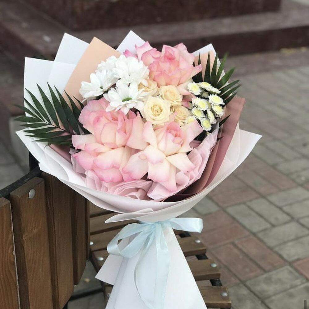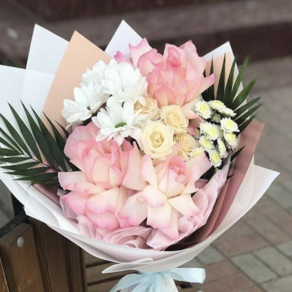 Альстромерии, Гвоздики, Кустовые розы, Лизиантусы, Розы, Хризантемы