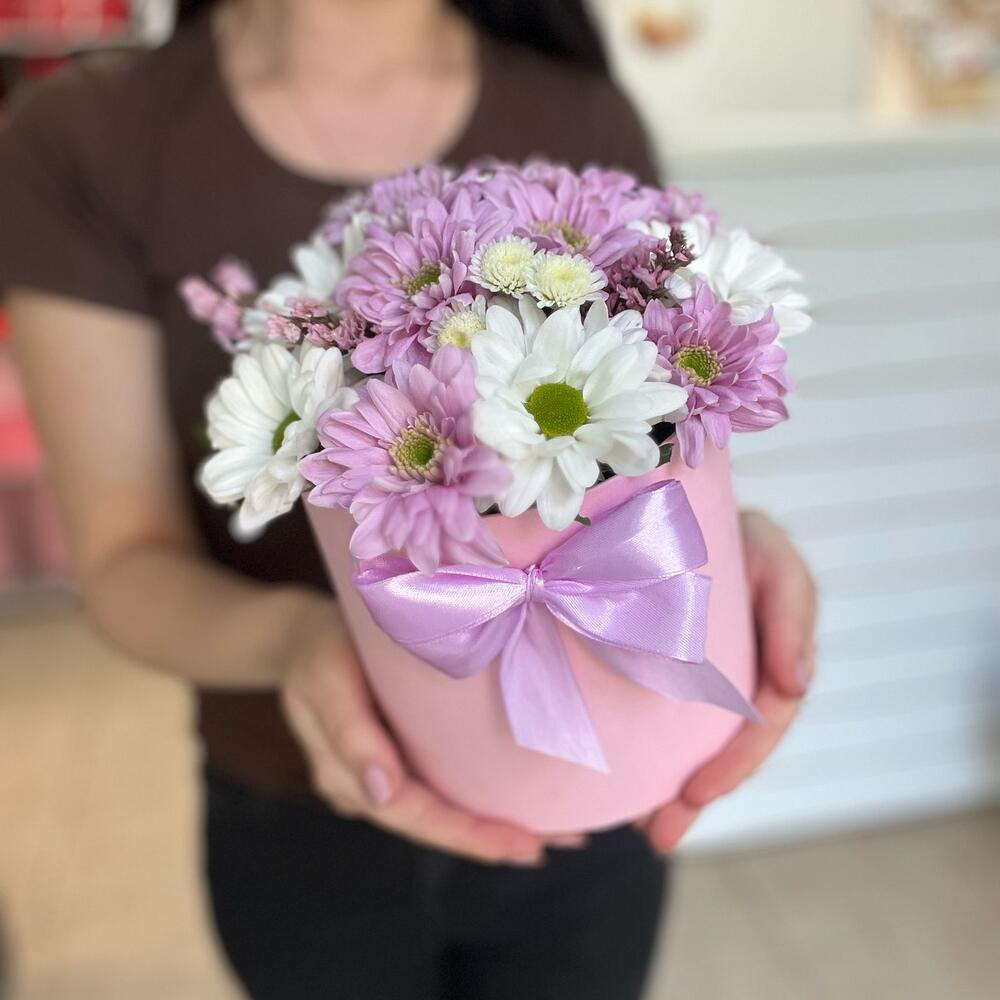 Хризантема кустовая сиреневая – 2 шт.Хризантема кустовая белая – 1 шт.Хризантема Сантини – 1 шт.Статица – 1 шт.Зелень – 1 шт.Шляпная коробка – 1 шт.Флористическая губка – 1 шт.Атласная лента – 1 шт.Открыточка с вашими пожеланиями – 1 шт.