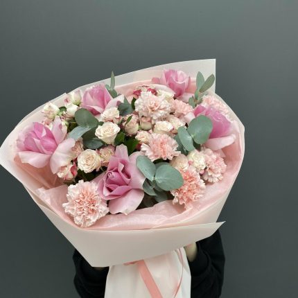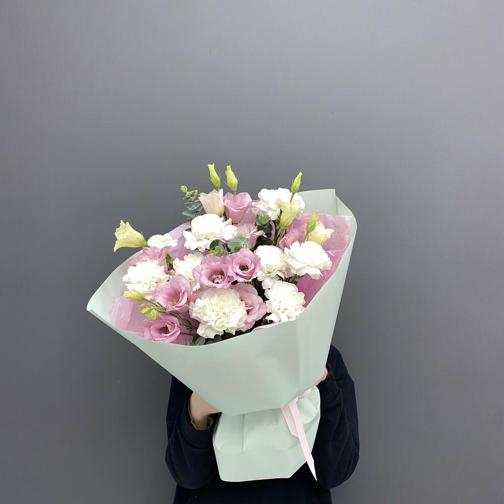 Альстромерии, Гвоздики, Кустовые розы, Лизиантусы, Розы, Хризантемы