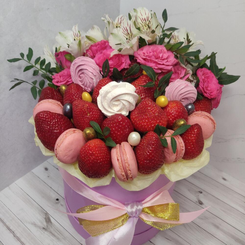 Альстромерия – 2 шт.Клубника – 500 гр.Кустовая роза – 3 шт.Шляпная коробка – 1 шт.маккаруны – 5 шт.Меренга (безе) ручной работы – 3 шт.