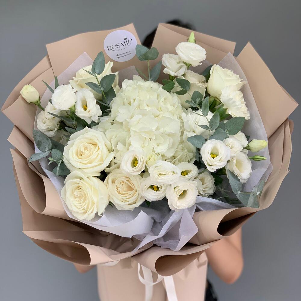 Альстромерии, Гвоздики, Кустовые розы, Лизиантусы, Розы, Хризантемы