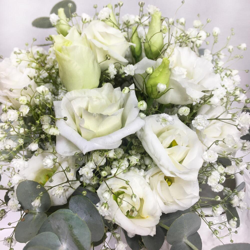 Эустома – 1 шт.Гипсофила – 3 шт.Эвкалипт – 14 шт.Лента атласная – 3 шт.