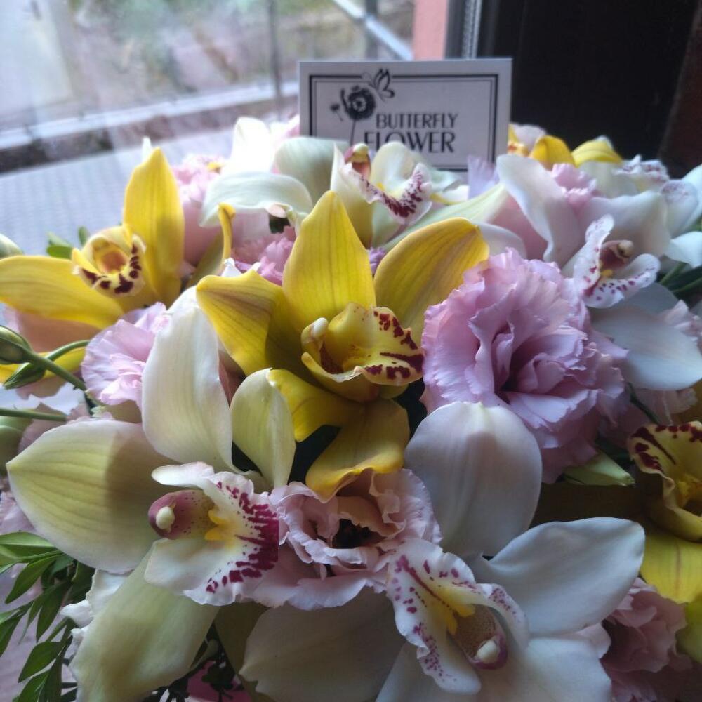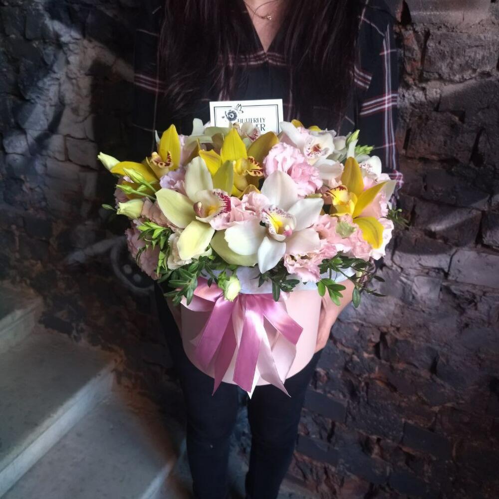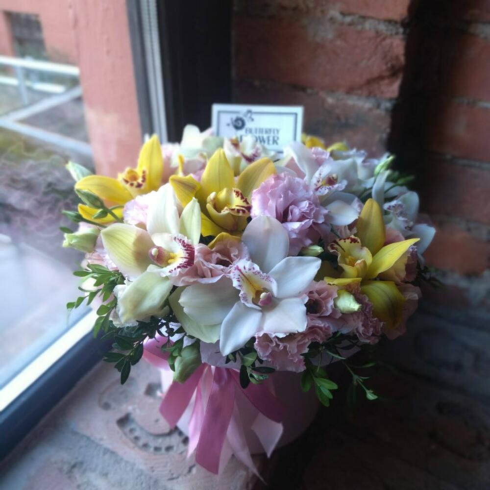 Эустома – 5 шт.Фисташка – 5 шт.Орхидея Цимбидиум – 13 шт.Коробка шляпная – 1 шт.Оазис – 1 шт.