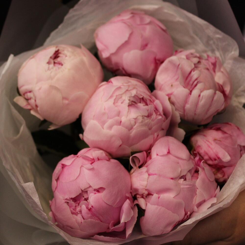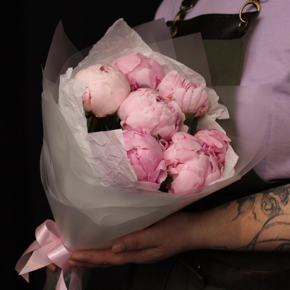 Лента атласная – 2 шт.Пион Сара Бернар – 7 шт.Пленка матовая – 3 шт.Тишью белое – 3 шт.