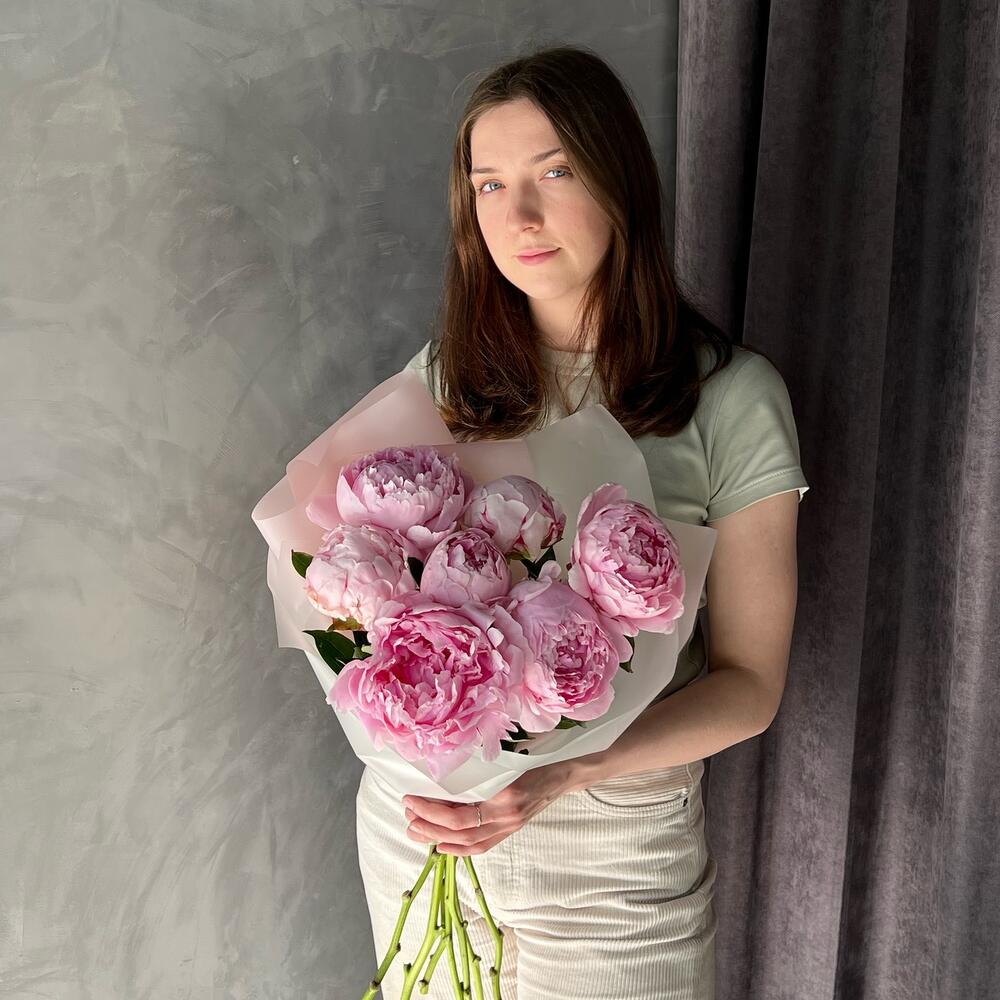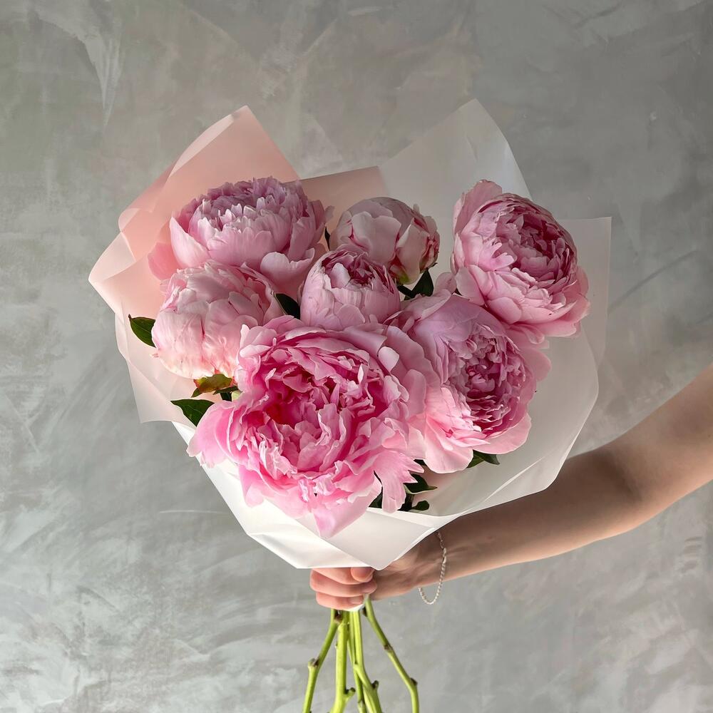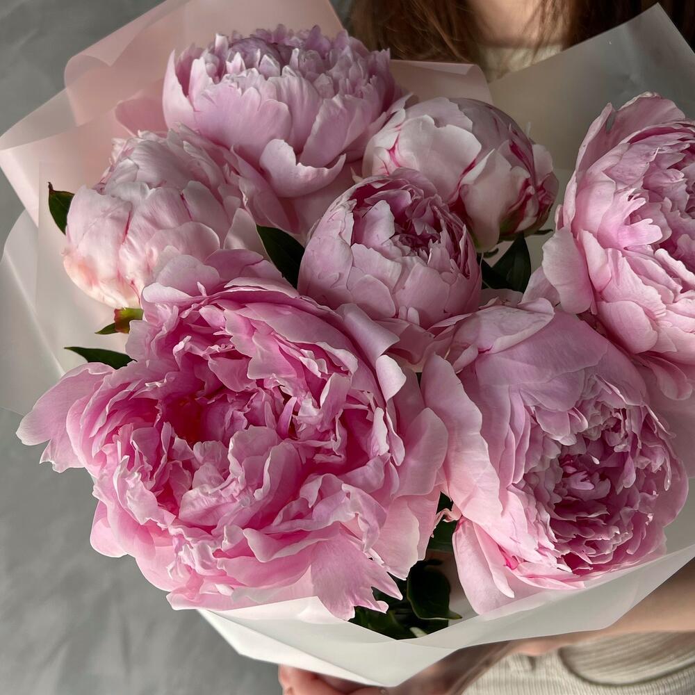 Лента – 1 шт.Дизайнерская упаковка – 1 шт.пион sarah bernard – 7 шт.
