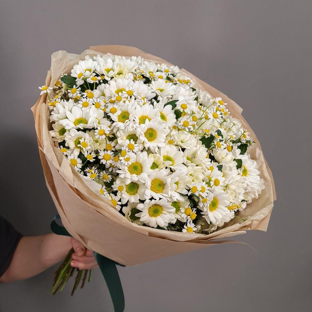 Ромашка кустовая – 13 шт.Аквапак – 1 шт.Сантини Росси Вайт – 12 шт.Упаковка крафт – 1 шт.витамины для цветов – 2 шт.