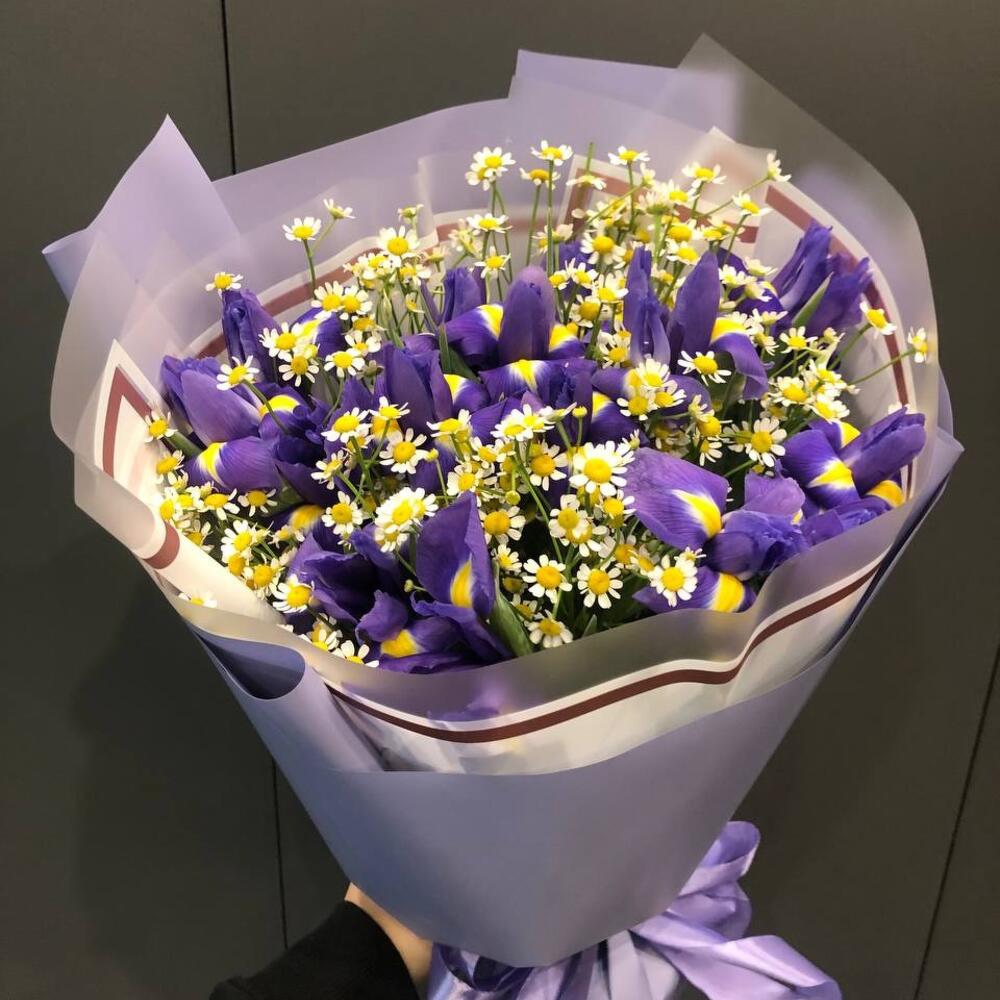 Букет из ирисов и ромашек