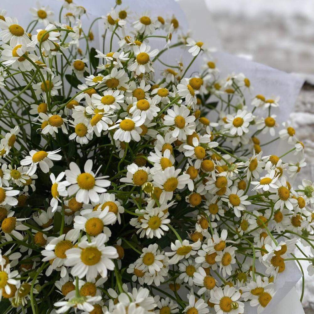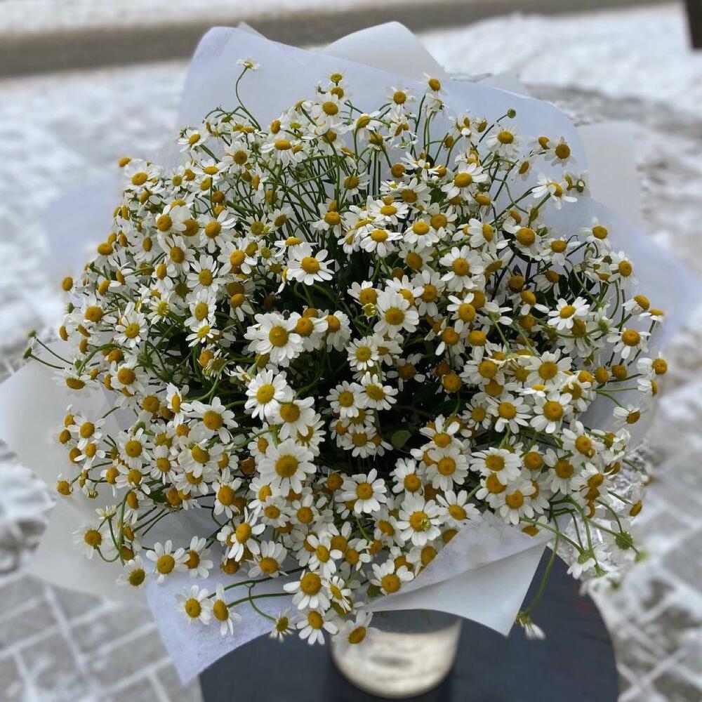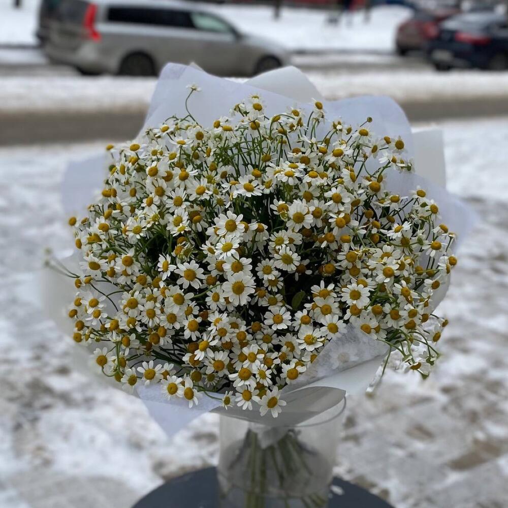 Лента атласная – 2 шт.Упаковка дизайнерская – 3 шт.матрикария ромашка кустовая – 15 шт.