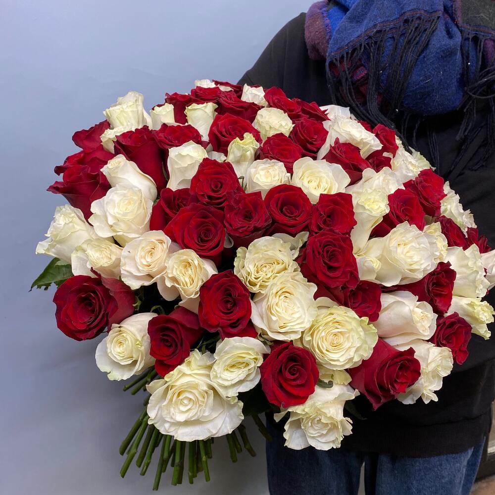 Роза эквадор 50 см – 101 шт.Пленка прозрачная – 1 шт.Лента атласная – 1 шт.