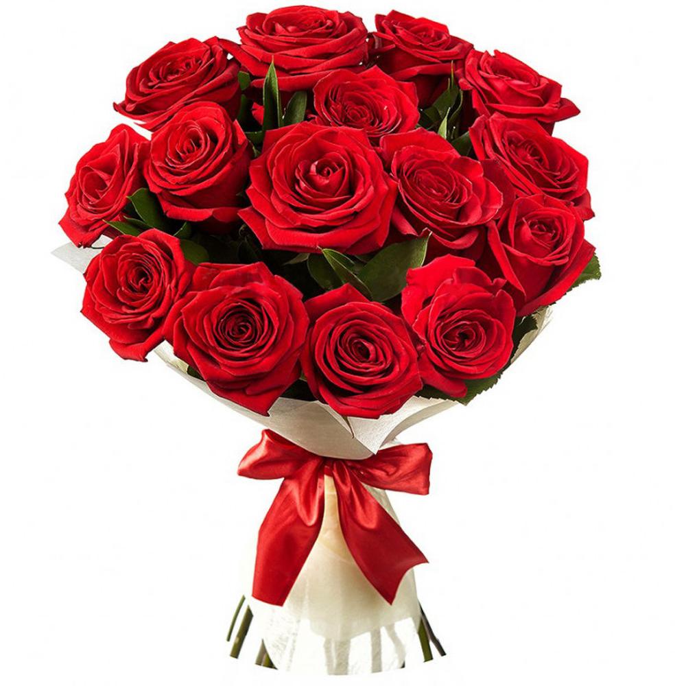 Роза красная – 15 шт.Рускус – 9 шт.Упаковка – 1 шт.Атласная лента – 1 шт.