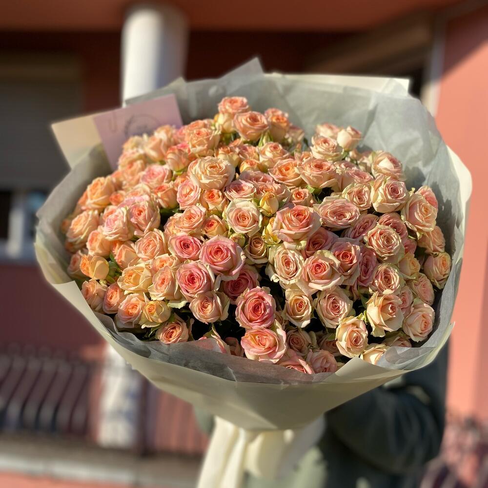 Букет из 25 кустовых веток сорта Azor с дизайнерским оформлением. Количество розочек (бутонов ) в букете может достигать 171 штуки