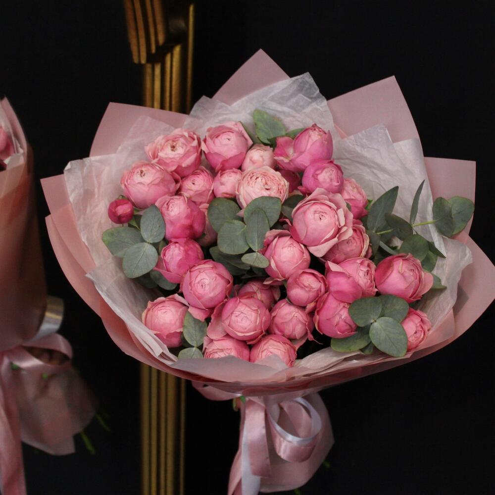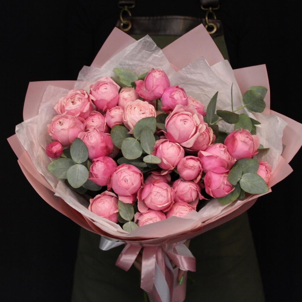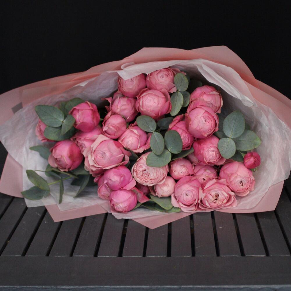Эвкалипт – 3 шт.Лента атласная – 2 шт.Пленка матовая – 3 шт.Тишью белое – 3 шт.роза пионовидная сильва пинк – 9 шт.