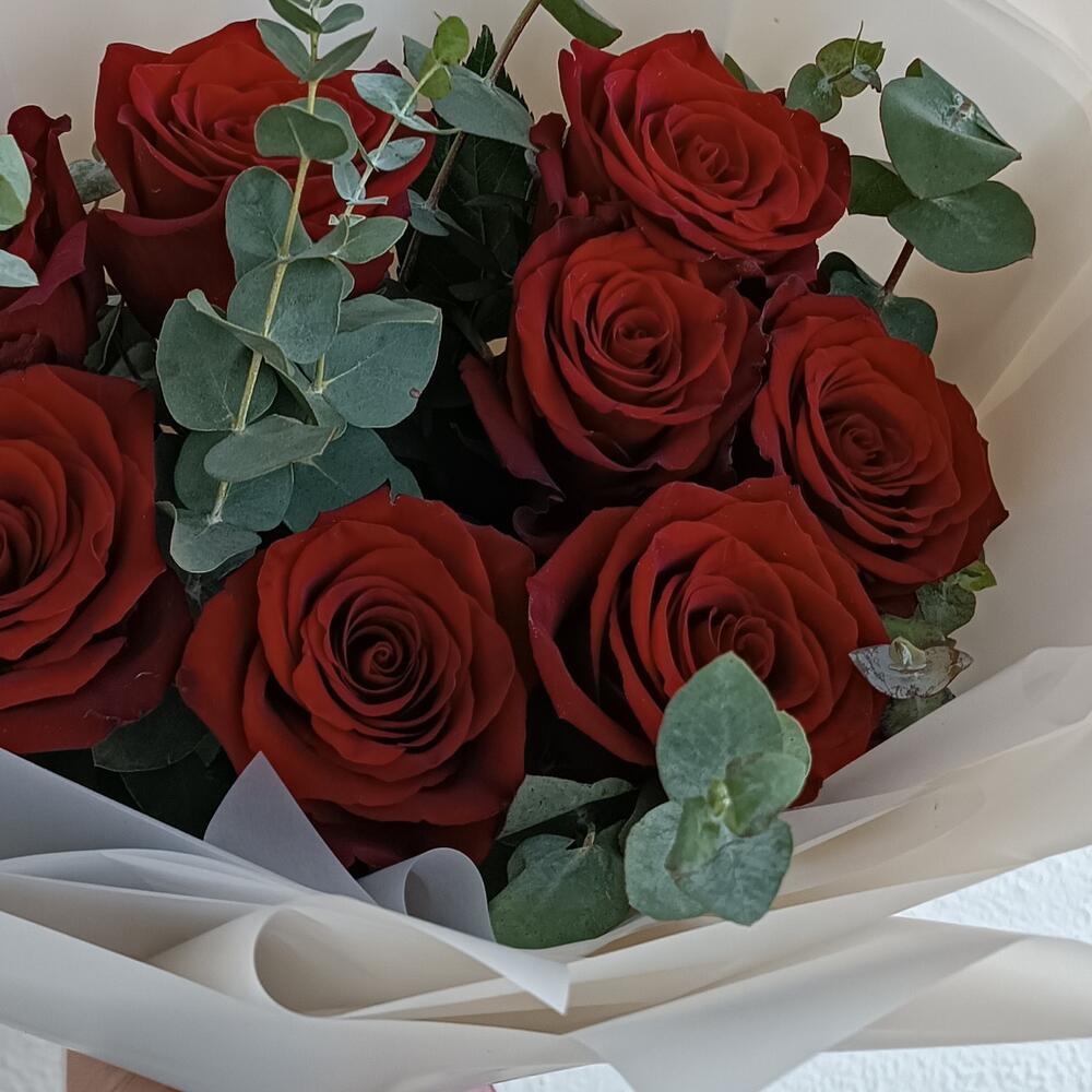 Самый страстный классический вариант бордовых роз с крупным бутоном и ароматным эвкалиптом. Такой букет расскажет о ваших чувствах , подойдет для любого повода (день рождения , юбилей, просто выражение симпатии)