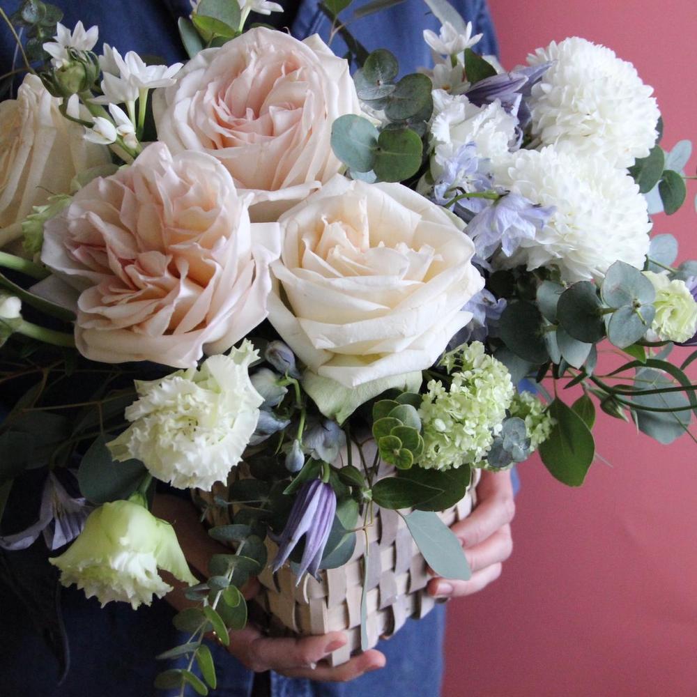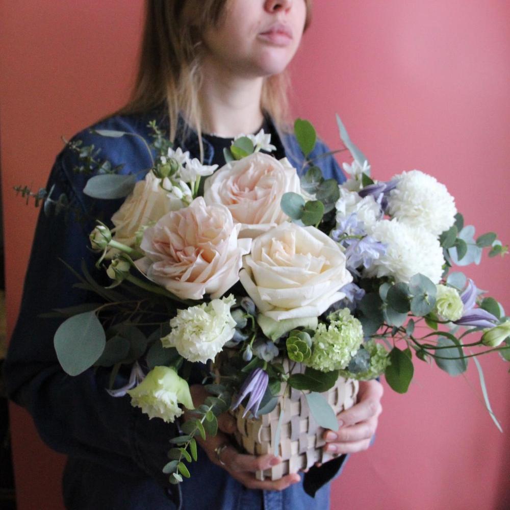 Хризантема – 2 шт.Роза пионовидная – 5 шт.Клематис – 2 шт.Нарцисс – 3 шт.Лизиантус – 3 шт.Вибурнум – 2 шт.Эвкалипт – 5 шт.Лукошко – 1 шт.Оазис флористический – 1 шт.