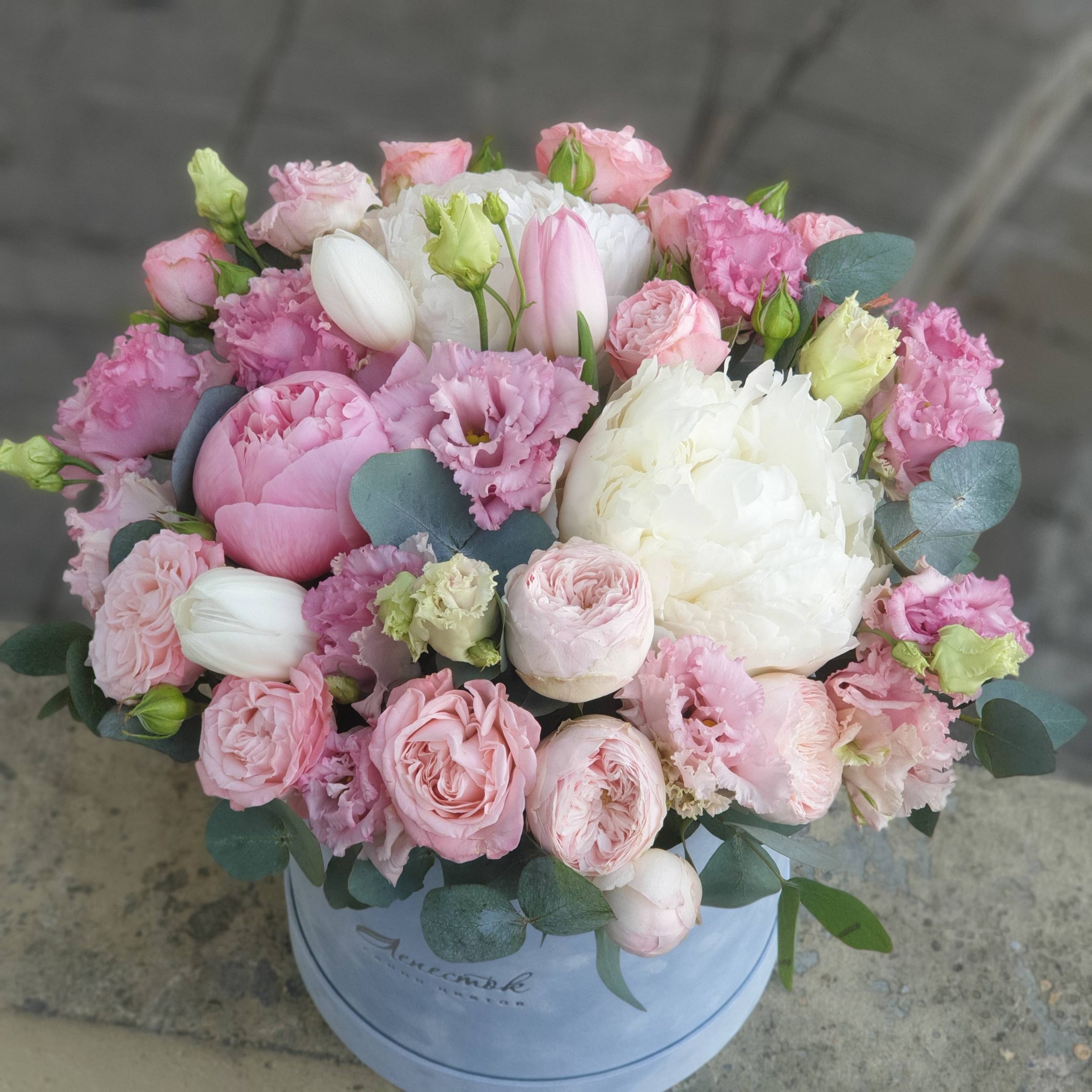 "Атлас☁️" - цветочная композиция с зефиром в деревянном ящике