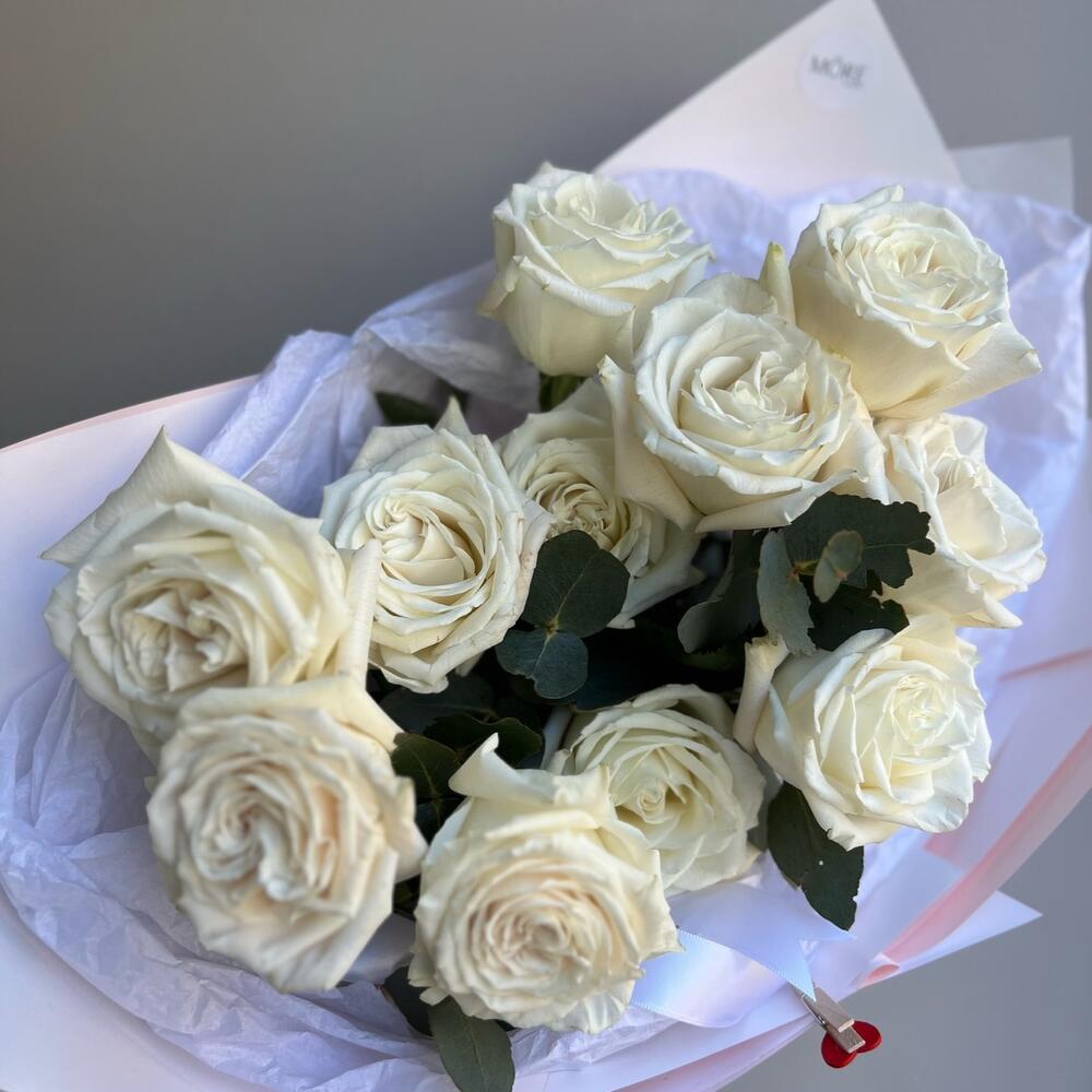Белый моно букет из 11 роз и эвкалипта