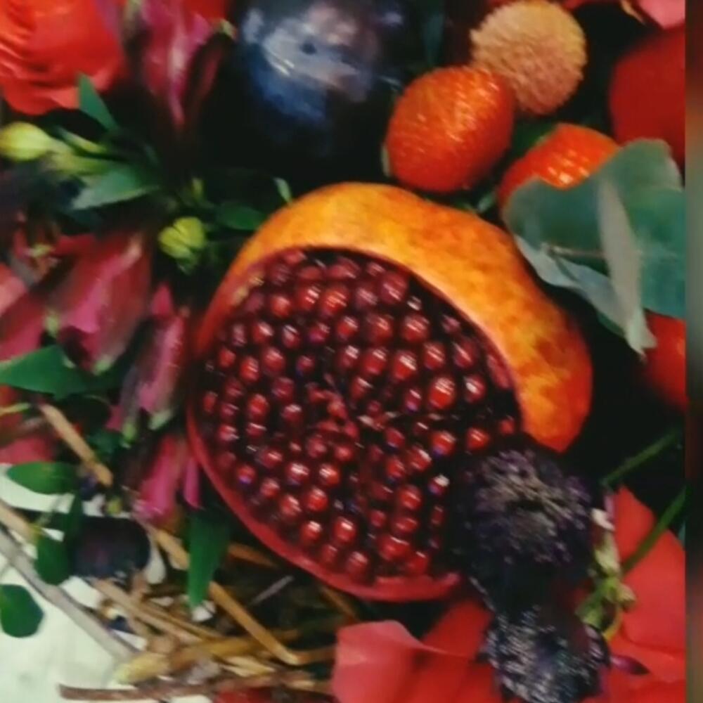 Клубника – 15 шт.Роза красная – 7 шт.Лента атласная – 1 шт.Гранат – 1 шт.Слива – 5 шт.Виноградная лоза – 9 шт.Виноград гроздь – 5 шт.зелень декоративная – 10 шт.виноград черный – 2 шт.экзотика – 7 шт.микс цветов – 11 шт.упаковка дизайнерская1 – 1 шт.