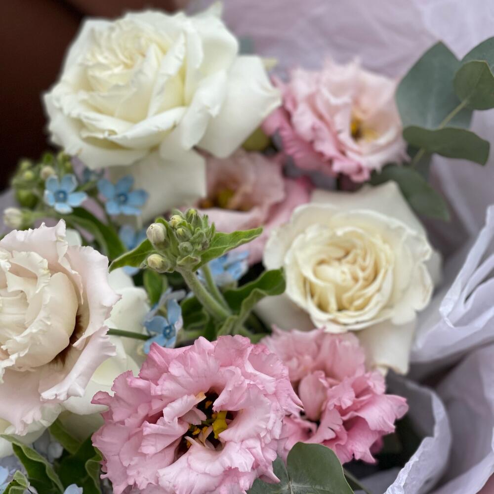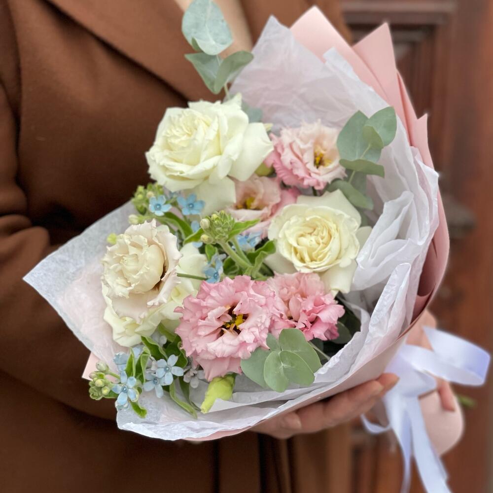 роза пионовидная плайа бланка – 3 шт.эустома махровая селеб квин – 1 шт.Оксипеталум – 3 шт.Эвкалипт – 1 шт.Тишью – 2 шт.Пленка матовая – 2 шт.Лента атласная – 2 шт.