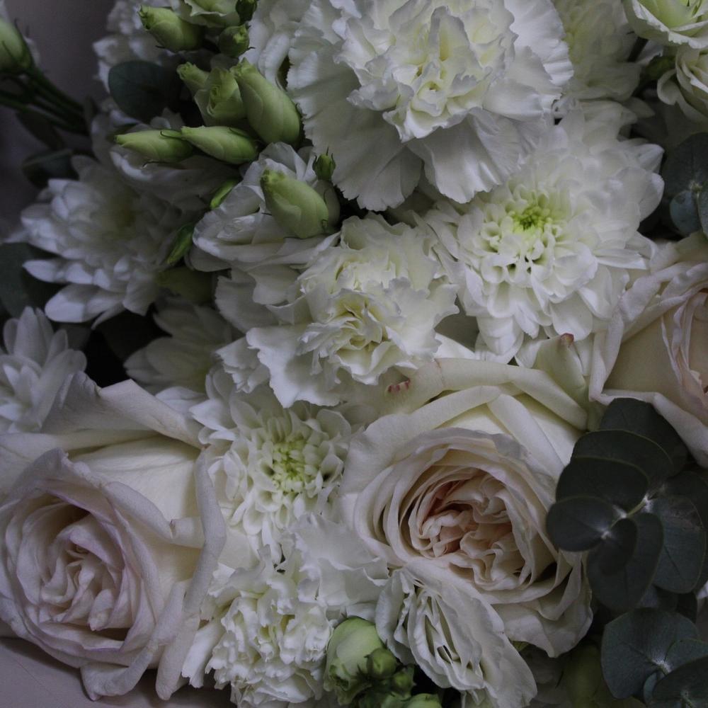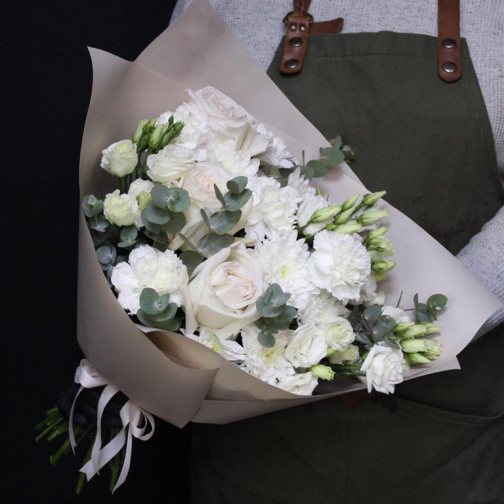 роза пионовидная white o’hara – 3 шт.Хризантема кустовая – 2 шт.Диантус сортовой – 5 шт.Эустома – 5 шт.Эвкалипт – 3 шт.Пленка дизайнерская – 3 шт.Лента атласная – 1 шт.