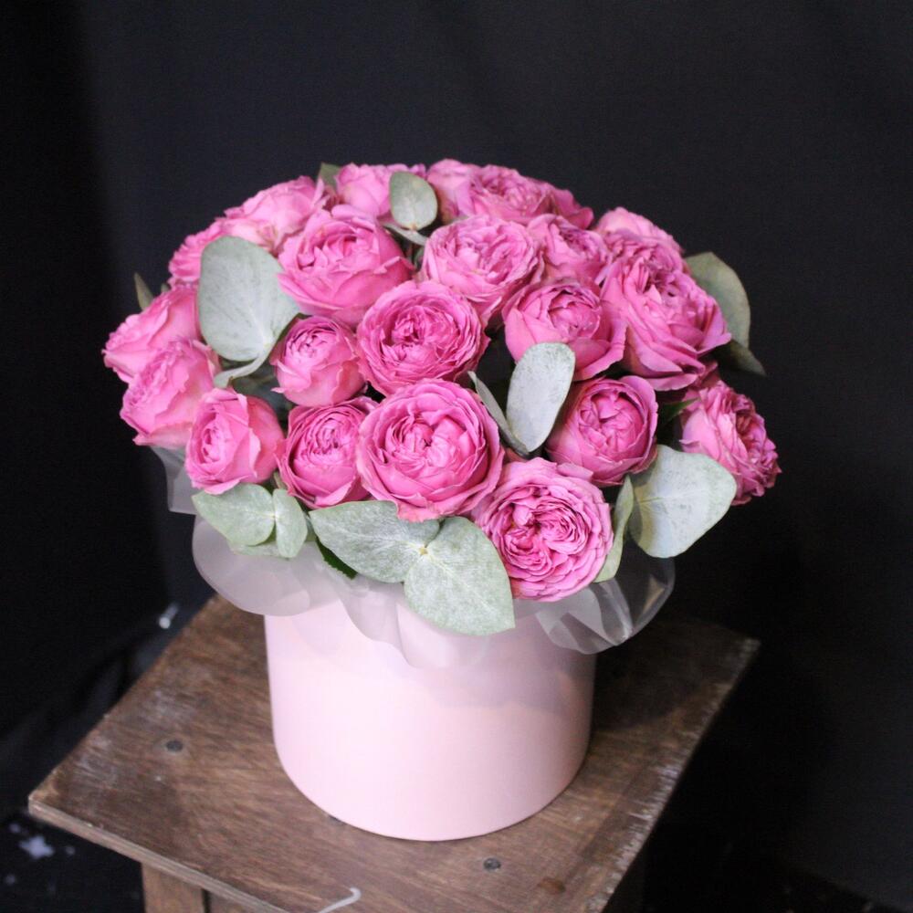 Эвкалипт – 3 шт.Шляпная коробка – 1 шт.Оазис флористический – 1 шт.Пленка дизайнерская – 2 шт.роза кустовая пионовидная misty bubbles – 11 шт.