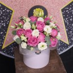 Эвкалипт – 2 шт.Шляпная коробка – 1 шт.Оазис флористический – 1 шт.эустома белая – 3 шт.Пленка дизайнерская – 1 шт.роза кустовая пионовидная misty bubbles – 4 шт.