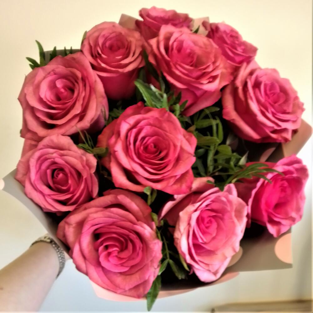 роза “лола” эквадор – 11 шт.зелень букетная – 2 шт.пленка флористическая – 1 шт.Лента атласная – 1 шт.