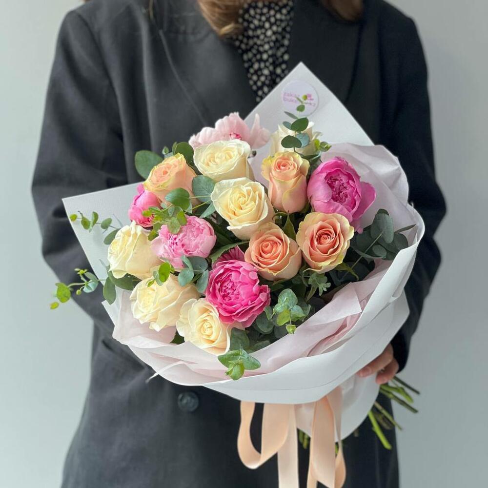 Гвоздики, Лизиантусы, Розы, Тюльпаны