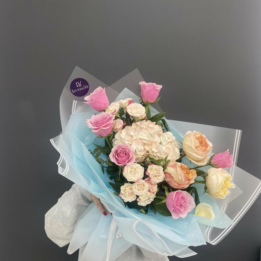 Гвоздики, Лизиантусы, Розы, Тюльпаны