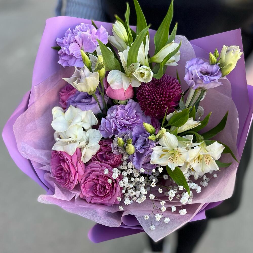 Альстромерия – 2 шт.Гипсофила – 1 шт.Фрезия – 1 шт.Лента атласная – 1 шт.Диантус – 2 шт.Роза кустовая пионовидная – 2 шт.Упаковка дизайнерская – 3 шт.подкормка для срезанных цветов – 1 шт.памятка по уходу – 1 шт.хризантема густав – 1 шт.