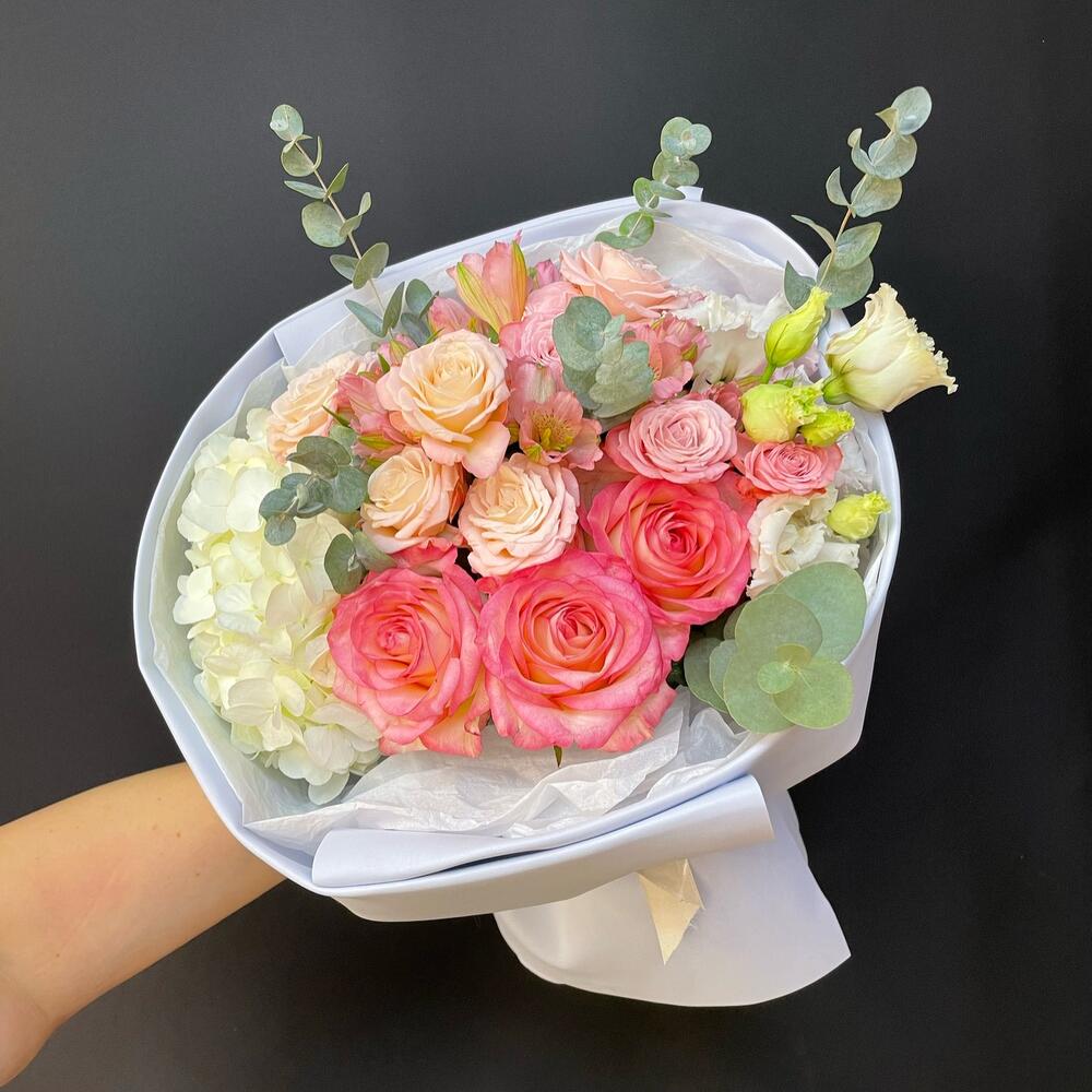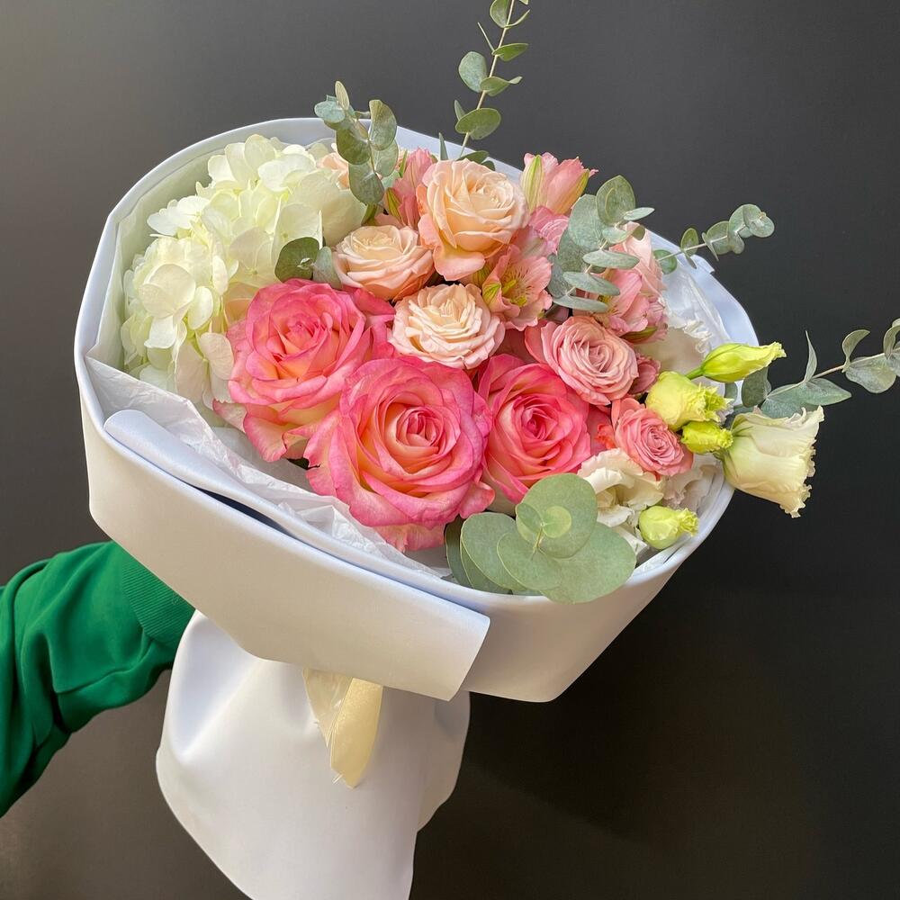 Альстромерия – 2 шт.Гортензия – 1 шт.Лизиантус – 2 шт.Эвкалипт – 2 шт.Роза – 3 шт.Кустовая роза – 3 шт.Лента атласная – 1 шт.Тишью – 2 шт.Упаковка дизайнерская – 1 шт.