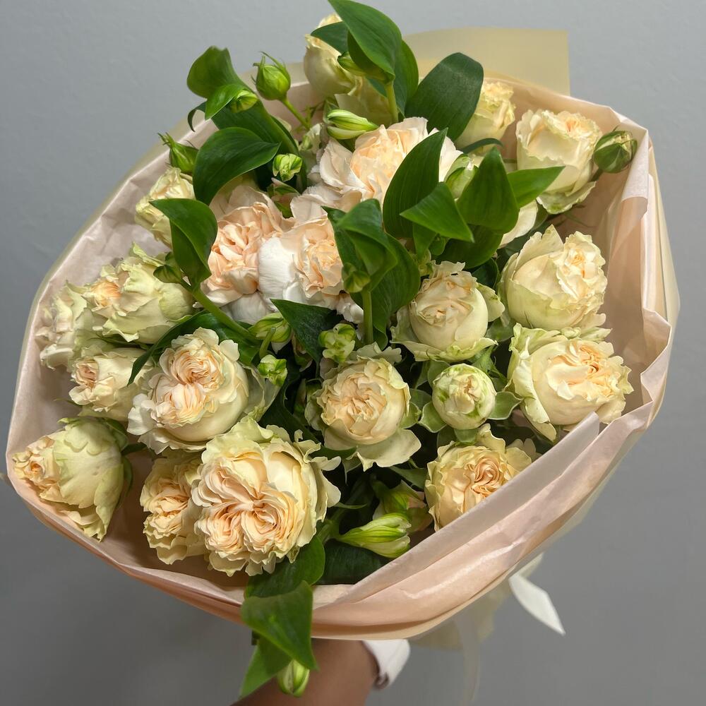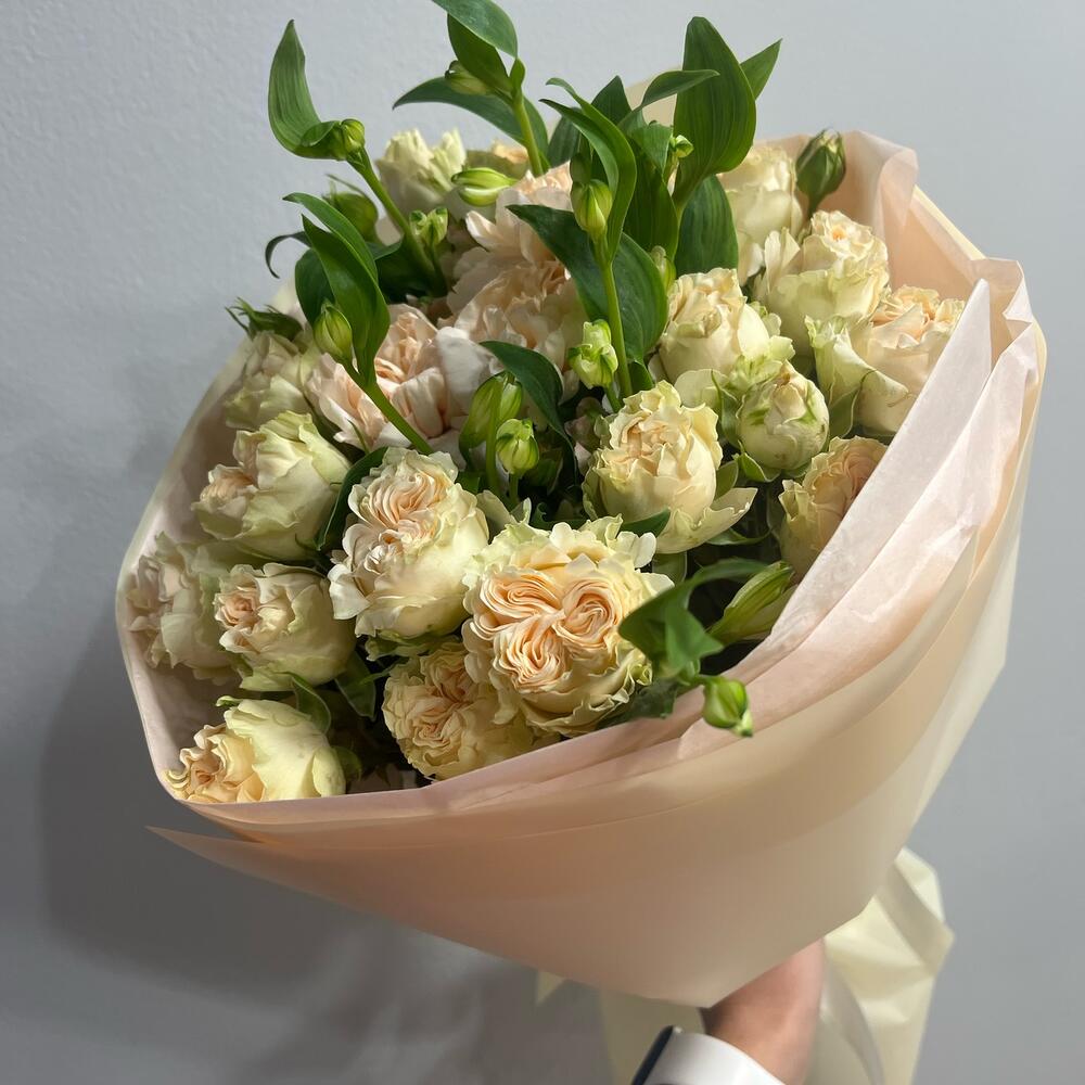 Кустовая пионовидная роза – 5 шт. Гвоздика персиковая – 3 шт. Авторская упаковка – 1 шт. шармелия – 2 шт.