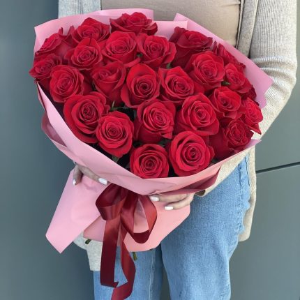 Оформление – 1 шт. роза красная сорта freedom – 19 шт. роза розовая сорта pink mondial – 18 шт.