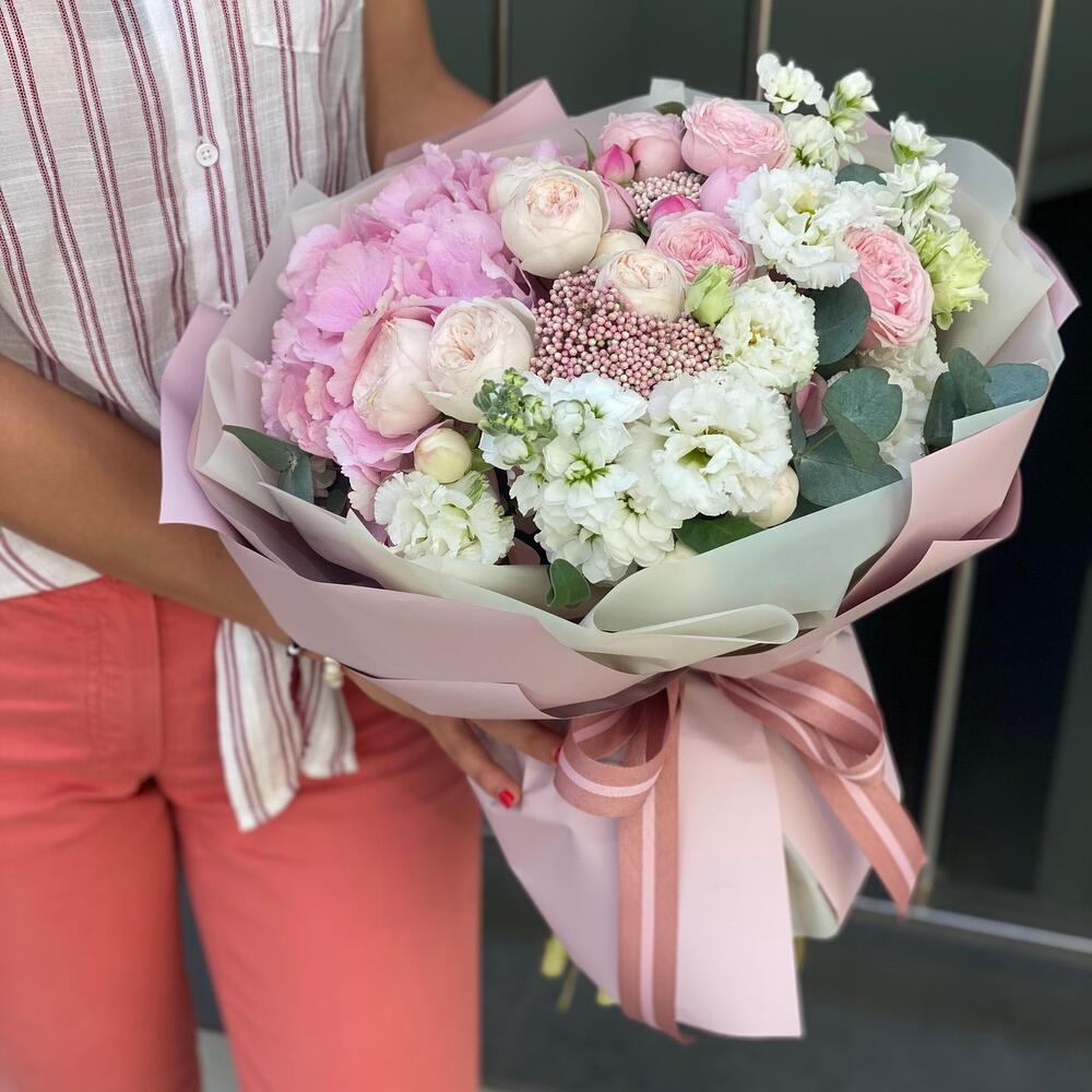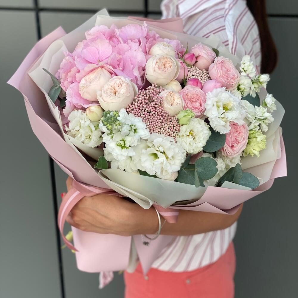 Букет Филинг из гортензии, пионовидной розы, озотамнуса и маттиолы