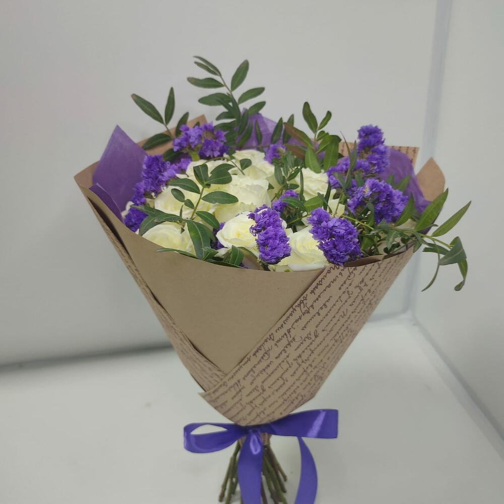 Статица – 2 шт.зелень фисташки – 2 шт.дизайнерская упаковка (крафт) – 1 шт.роза белая кения – 15 шт.