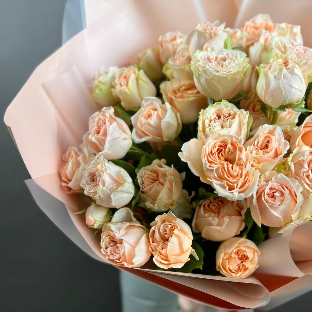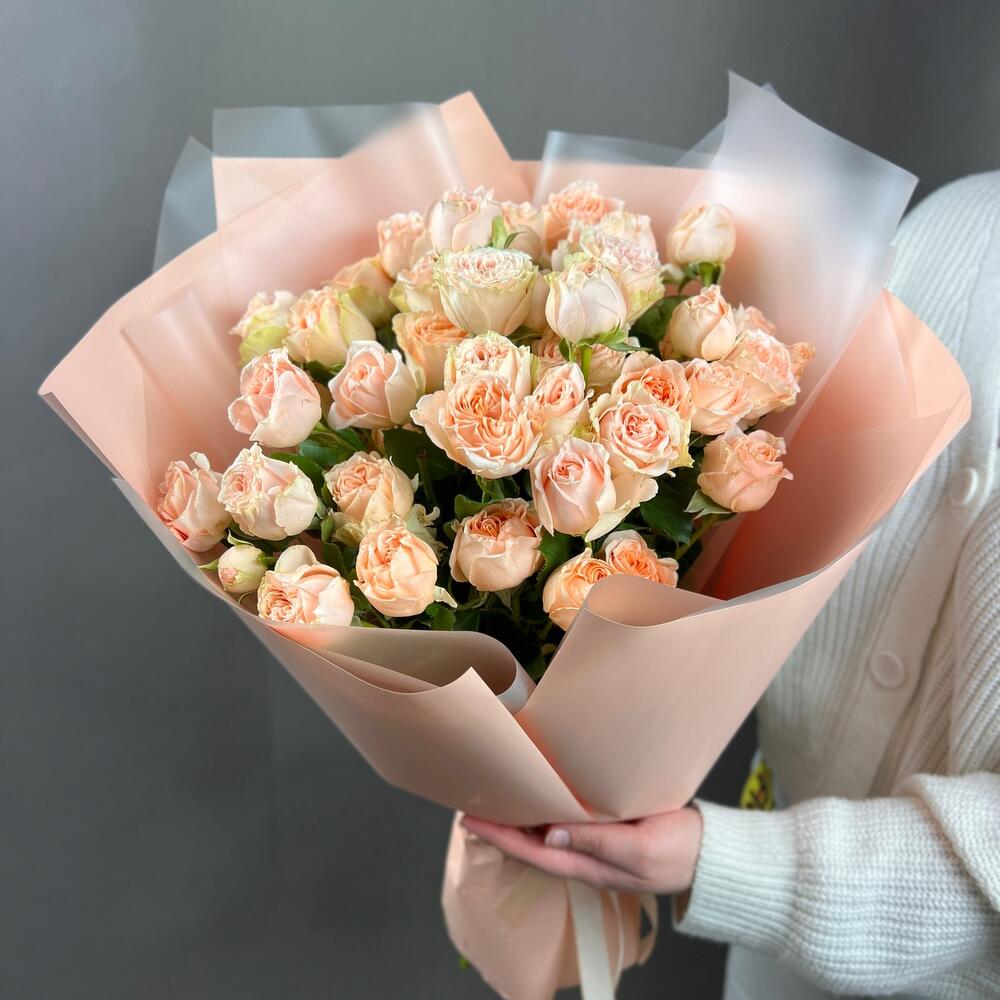 Лента атласная – 2 шт.Роза кустовая пионовидная – 9 шт.Пленка матовая – 5 шт.пленка полупрозрачная матовая – 4 шт.