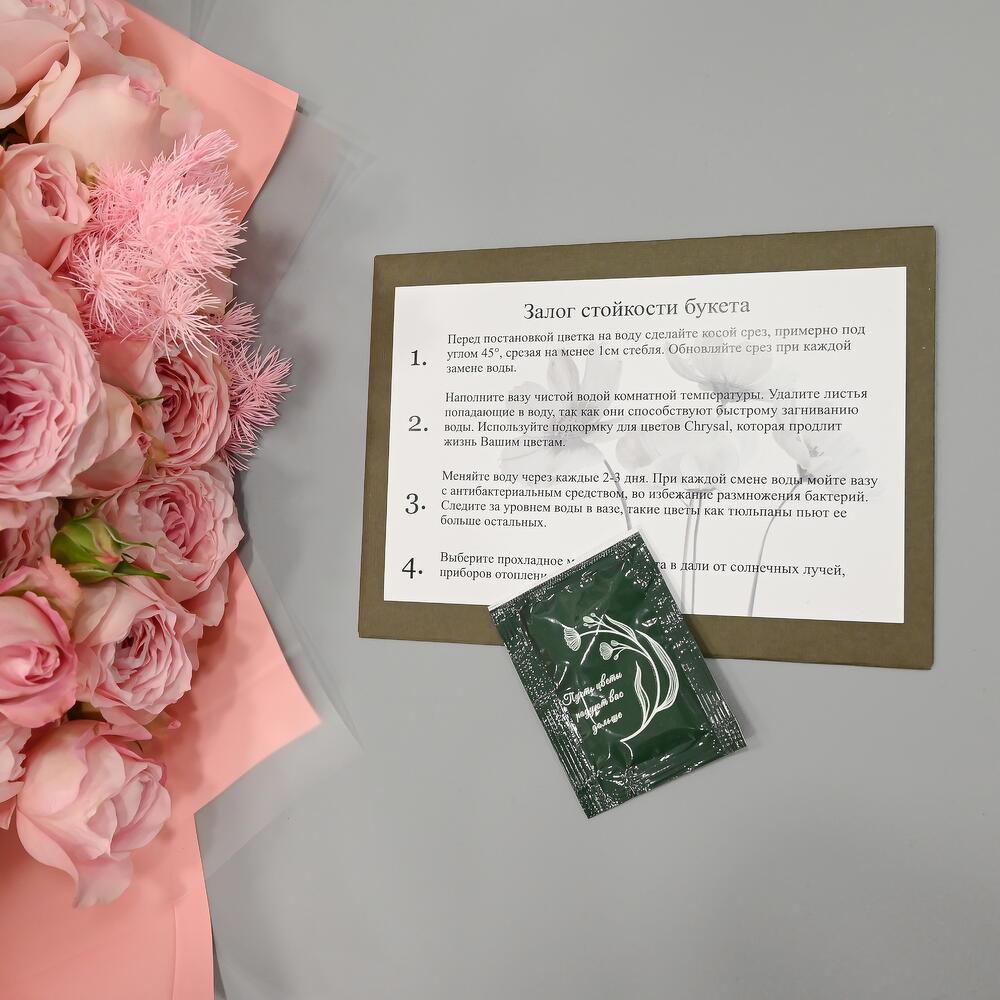 - Сроки возврата: Претензии по качеству букета принимаются в течение 24 часов с момента его получения.
