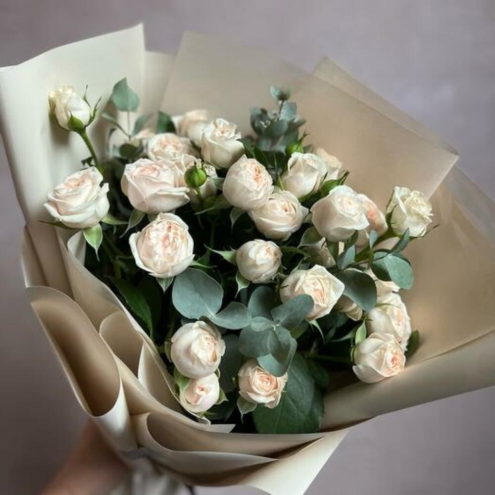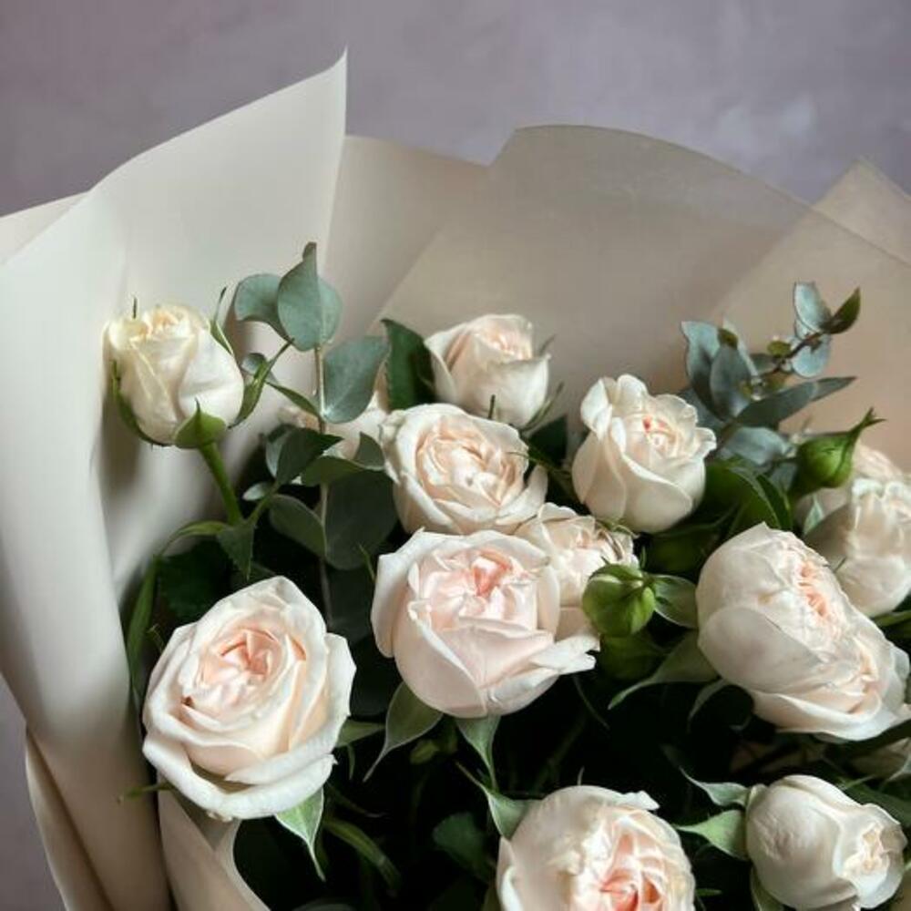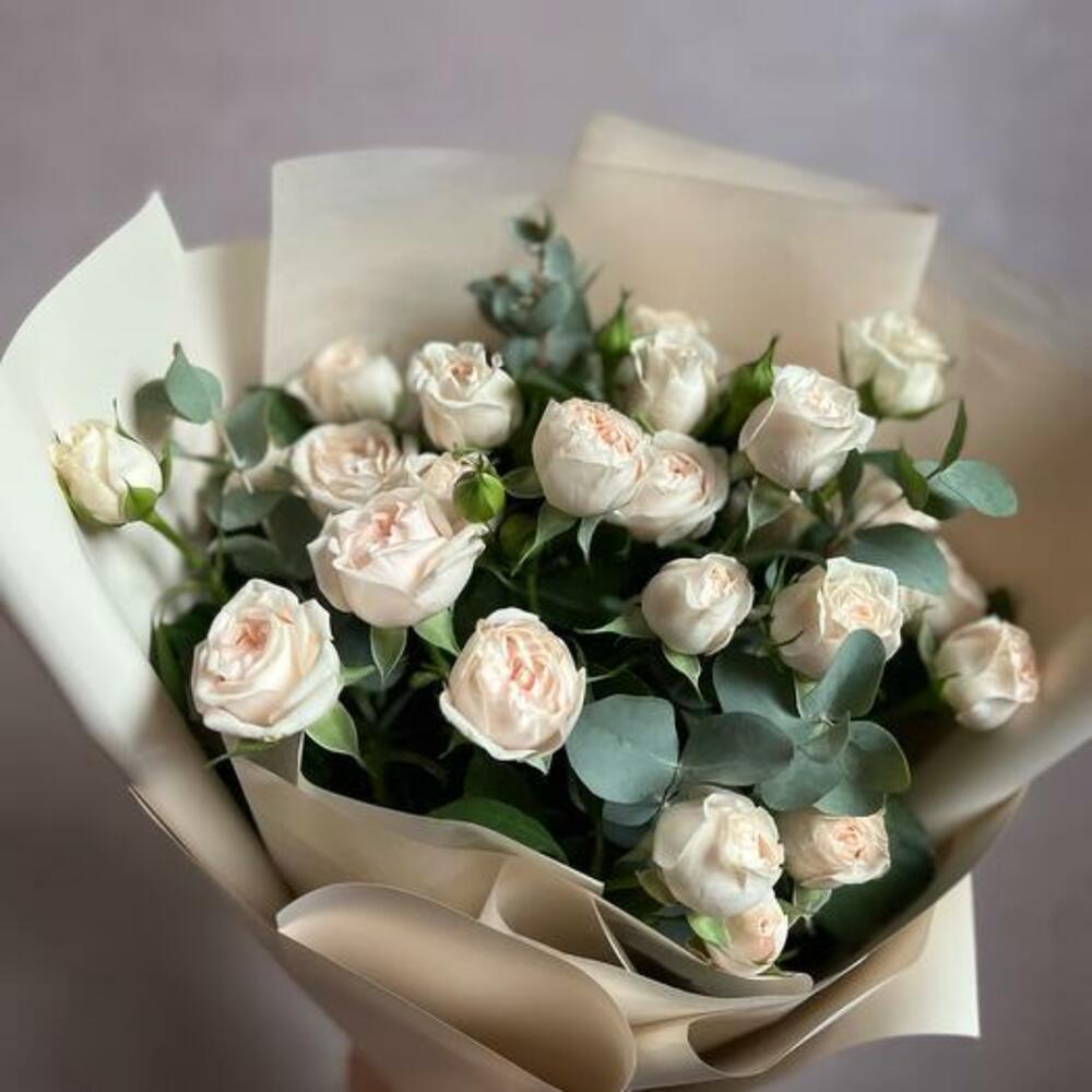 Букет из пионовидной кустовой розы и эвкалипта “Нежность”